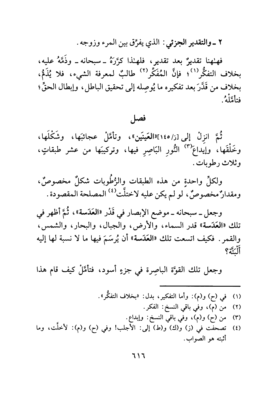 وجعل - سبحانه - موضع الإبصار في قَدْر "العَدَسة"، ثُمَّ أظهر في تلك "العَدَسة" قدر السماء، والأرض، والجبال، والبحار، والشمس، والقمر. فكيف اتسعت تلك "العَدَسة" أن يُرسَمَ فيها ما لا نسبة لها إليه أَلْبَتَّة؟