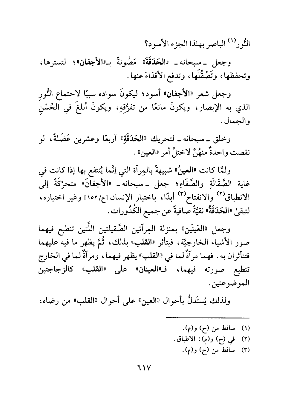ولمَّا كانت "العينُ" شبيهةً بالمِرآة التي إنَّما يُنتفع بها إذا كانت في غاية الصَّقَالَةِ والصَّفَاءِ؛ جعل - سبحانه - "الأجفان" متحرِّكَةً إلى الانطباق (¬٢) والانفتاح (¬٣) أبدًا، باختيار الإنسان وغير اختياره، لتبقى "الحَدَقَةُ" نقيَّةً صافيةً عن جميع الكُدُورات.