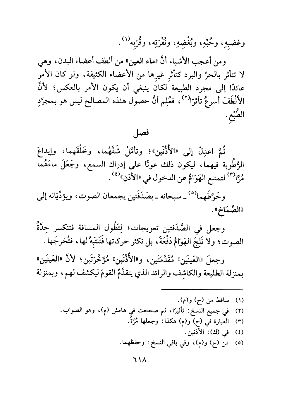 ومن أعجب الأشياء أنَّ "ماء العين" من ألطف أعضاء البدن، وهي لا تتأثر بالحرِّ والبرد كتأثرِ غيرِها من الأعضاء الكثيفة، ولو كان الأمر عائدًا إلى مجرد الطبيعة لكان ينبغي أن يكون الأمر بالعكس؛ لأنَّ الأَلْطَفَ أسرعُ تأثرًا (¬٢)، فعُلِم أنَّ حصول هذه المصالح ليس هو بمجرَّدِ الطَّبْعِ.