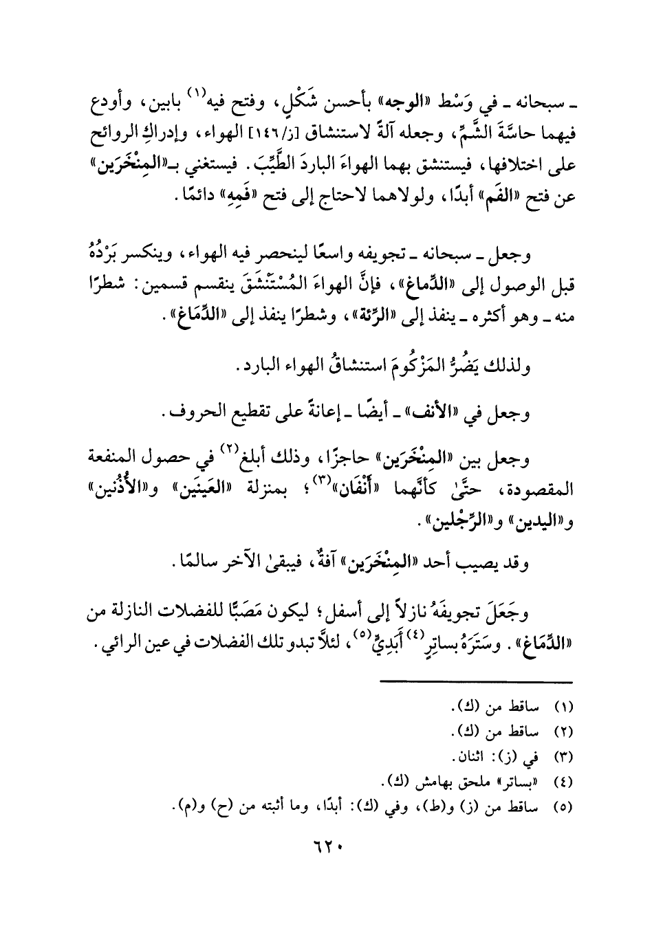 وجَعَلَ تجويفَهُ نازلًا إلى أسفل؛ ليكون مَصَبًّا للفضلات النازلة من "الدِّمَاغ". وسَتَرَهُ بساتِرٍ (¬٤) أَبَدِيٍّ (¬٥) ، لئلَّا تبدو تلك الفضلات في عين الرائي.