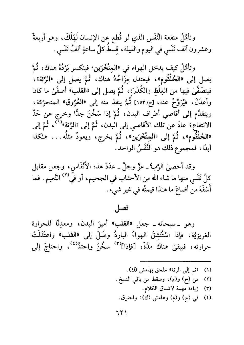 وتأمَّلْ كيف يدخل الهواء في "المِنْخَرَين" فينكسر بَرْدُهُ هناك، ثُمَّ يصل إلى "الحُلْقُوم"، فيعتدل مِزَاجُهُ هناك، ثُمَّ يصل إلى "الرِّئة"، فيتصَفَّى فيها من الغِلَظِ والكُدْرَةِ، ثُمَّ يصل إلى "القلب" أصفَى ما كان وأعدَلَ، فيُرَوِّحُ عنه، ثُمَّ ينفذ منه إلى "العُرُوق" المتحرِّكة، ويتقدَّم إلى أقاصي أطراف البدن، ثُمَّ إذا سَخُنَ جدًّا وخرج عن حَدِّ الانتفاع؛ عادَ عن تلك الأقاصي إلى البدن، ثُمَّ إلى "الرِّئة" (¬١)، ثُمَّ إلى "الحُلْقُوم"، ثُمَّ إلى "المِنْخَرَين"، ثُمَّ يخرج، ويعودُ مثلُه ... هكذا أبدًا، فمجموع ذلك هو النَّفَسُ الواحد.