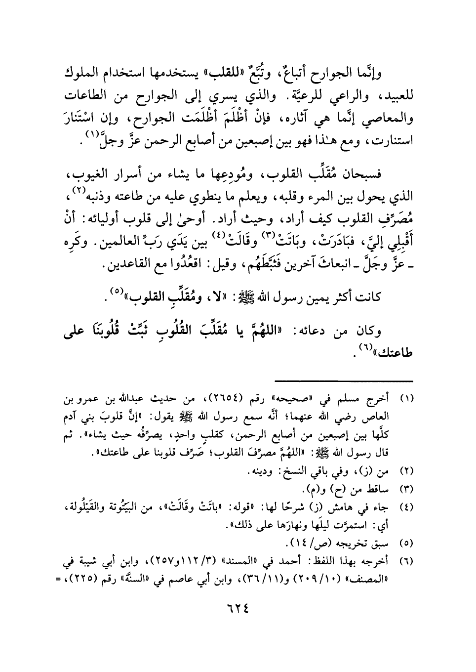 (¬١) أخرج مسلم في "صحيحه" رقم (٢٦٥٤)، من حديث عبد الله بن عمرو بن العاص - رضي الله عنهما -؛ أنَّه سمع رسول الله - صلى الله عليه وسلم - يقول: "إنَّ قلوبَ بني آدم كلِّها بين إصبعين من أصابع الرحمن، كقلبٍ واحدٍ، يصرِّفُه حيث يشاء". ثم قال رسول الله - صلى الله عليه وسلم -: "اللهُمَّ مصرِّفَ القلوب؛ صَرِّف قلوبنا على طاعتك".