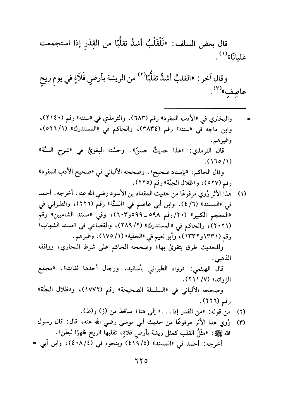 (¬٣) رُوي هذا الأثر مرفوعًا من حديث أبي موسى - رضي الله عنه -، قال: قال رسول الله - صلى الله عليه وسلم -: "مثلُ القلب كمثل ريشة بأرضٍ فلاةٍ، تقلبها الريح ظهرًا لبطن".