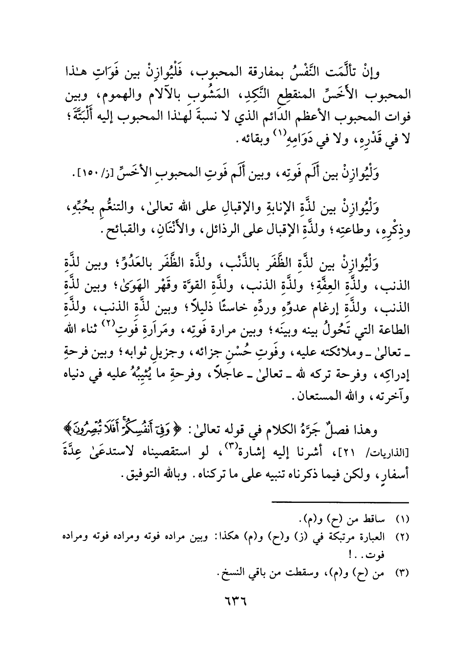 وإنْ تألَّمَت النَّفْسُ بمفارقة المحبوب، فَلْيُوازِنْ بين فَوَاتِ هذا المحبوب الأَخَسِّ المنقطِعِ النَّكِدِ، المَشُوبِ بالآلام والهموم، وبين فوات المحبوب الأعظم الدائم الذي لا نسبةَ لهذا المحبوب إليه أَلْبَتَّةَ؛ لا في قَدْرِهِ، ولا في دَوَامِهِ (¬١) وبقائه.