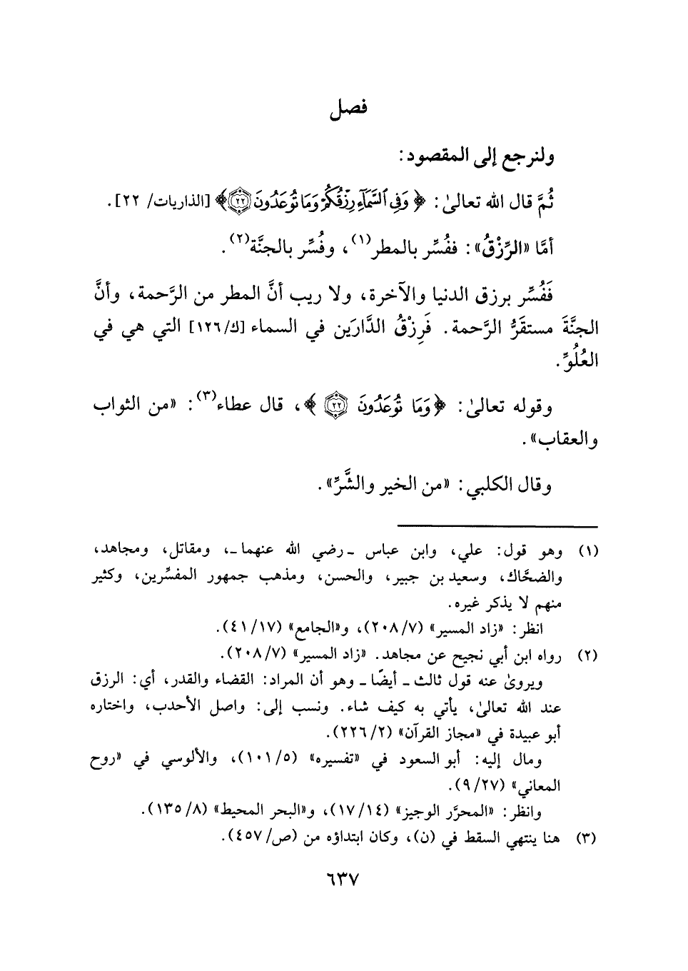 فَفُسِّر برزق الدنيا والآخرة، ولا ريب أنَّ المطر من الرَّحمة، وأنَّ الجنَّةَ مستقَرُّ الرَّحمة. فَرِزْقُ الدَّارَين في السماء التي هي في العُلُوِّ.