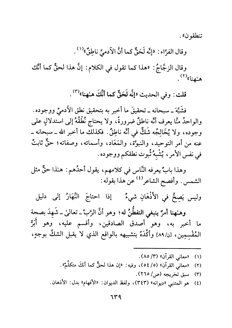 فشَبَّهَ - سبحانه - تحقيقَ ما أخبر به بتحقيق نطق الآدميِّ ووجوده. والواحدُ منَّا يعرف أنَّه ناطقٌ ضرورةً، ولا يحتاج نُطْقُهُ إلى استدلالٍ على وجوده، ولا يُخَالِجُه شَكٌّ في أنَّه ناطِقٌ. فكذلك ما أخبر الله - سبحانه - عنه من أمر التوحيد، والنبوَّة، والمَعَاد، وأسمائه، وصفاته؛ حقٌّ ثابتٌ في نفس الأمر، يُشْبِهُ ثُبوت نطقكم ووجوده.