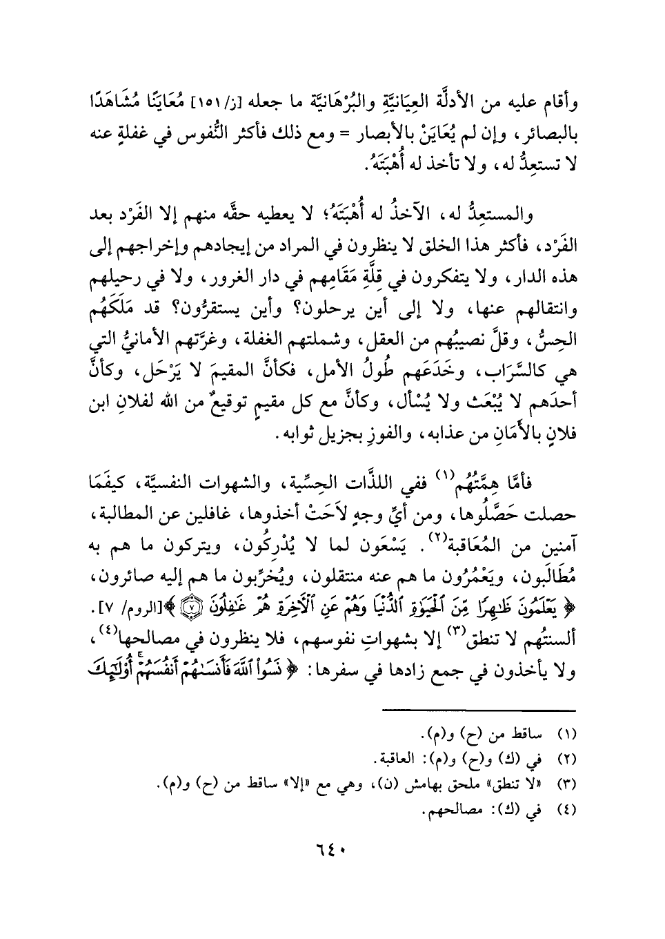 وأقام عليه من الأدلَّة العِيَانيَّةِ والبُرْهَانيَّة ما جعله مُعَايَنًا مُشَاهَدًا بالبصائر، وإن لم يُعَايَنْ بالأبصار = ومع ذلك فأكثر النُّفوس في غفلةٍ عنه لا تستعِدُّ له، ولا تأخذ له أُهْبَتَهُ.