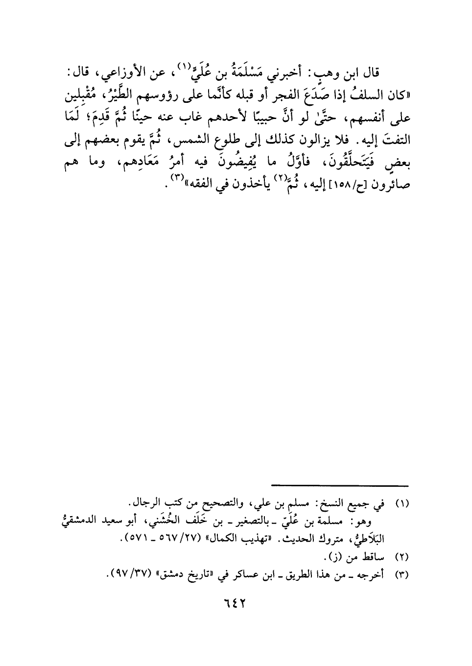 قال ابن وهبٍ: أخبرني مَسْلَمَةُ بن عُلَيٍّ (¬١) ، عن الأوزاعي، قال: "كان السلفُ إذا صَدَعَ الفجر أو قبله كأنَّما على رؤوسهم الطَّيْرُ، مُقْبِلين على أنفسهم، حتَّى لو أنَّ حبيبًا لأحدهم غاب عنه حينًا ثُمَّ قَدِمَ؛ لَمَا التفتَ إليه. فلا يزالون كذلك إلى طلوعِ الشمس، ثُمَّ يقوم بعضهم إلى بعضٍ فَيَتَحلَّقُونَ، فأوَّلُ ما يُفِيضُون فيه أمرُ مَعَادِهم، وما هم صائرون إليه، ثُمَّ (¬٢) يأخذون في الفقه" (¬٣) .