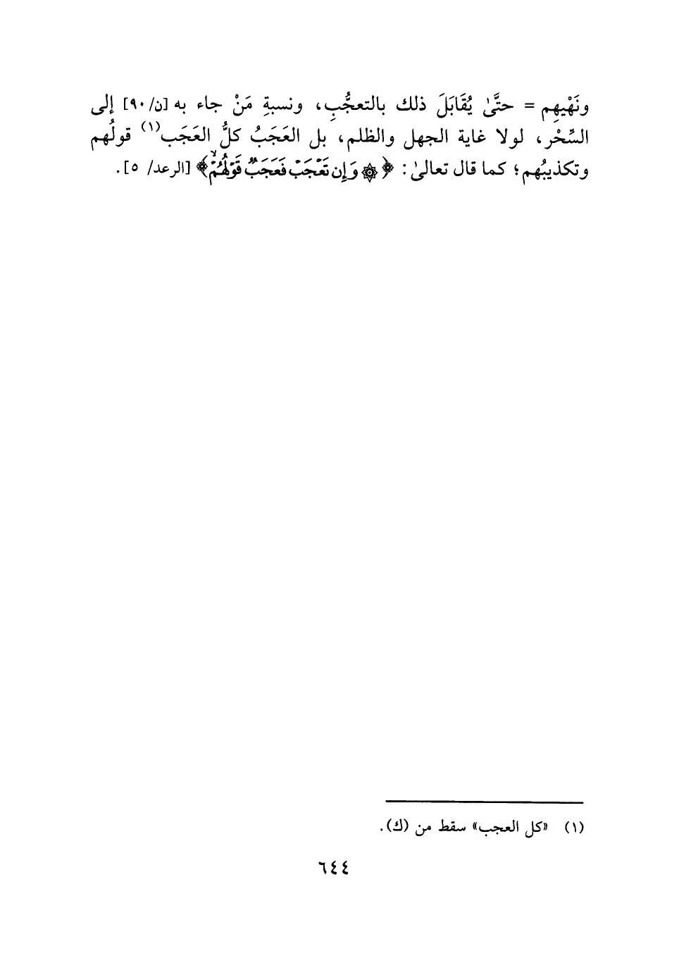 ونَهْيهِم = حتَّى يُقَابَلَ ذلك بالتعجُّبِ، ونسبةِ مَنْ جاء به إلى السِّحْر، لولا غاية الجهل والظلم، بل العَجَبُ كلُّ العَجَب (¬١) قولُهم وتكذيبُهم؛ كما قال تعالى: {وَإِنْ تَعْجَبْ فَعَجَبٌ قَوْلُهُمْ} [الرعد: ٥].