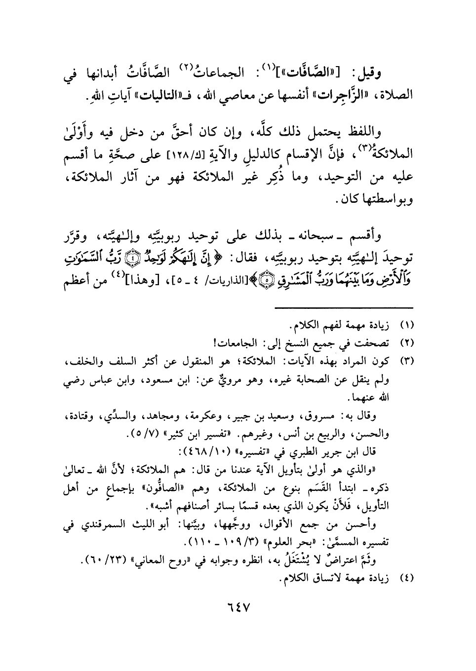 "والذي هو أولى بتأويل الآية عندنا من قال: هم الملائكة؛ لأنَّ الله - تعالى ذكره - ابتدأ القَسَم بنوع من الملائكة، وهم "الصافُّون" بإجماعٍ من أهل التأويل، فَلأَنْ يكون الذي بعده قسمًا بسائر أصنافهم أشبه".