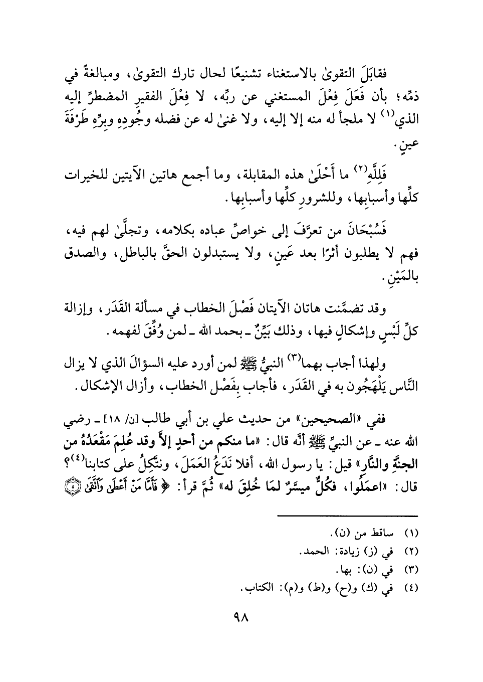 ففي "الصحيحين" من حديث علي بن أبي طالب [ن/ ١٨]- رضي الله عنه - عن النبيِّ - صلى الله عليه وسلم - أنَّه قال: "ما منكم من أحدٍ إلَّا وقد عُلِمَ مَقْعَدُهُ من الجنَّةِ والنَّارِ" قيل: يا رسول الله، أفلا نَدَعُ العَمَلَ، ونتَّكِلُ على كتابنا (¬٤) ؟ قال: "اعمَلُوا، فكُلٌّ ميسَّرٌ لمَا خُلِقَ له" ثُمَّ قرأ: {فَأَمَّا مَنْ أَعْطَى وَاتَّقَى (٥ )