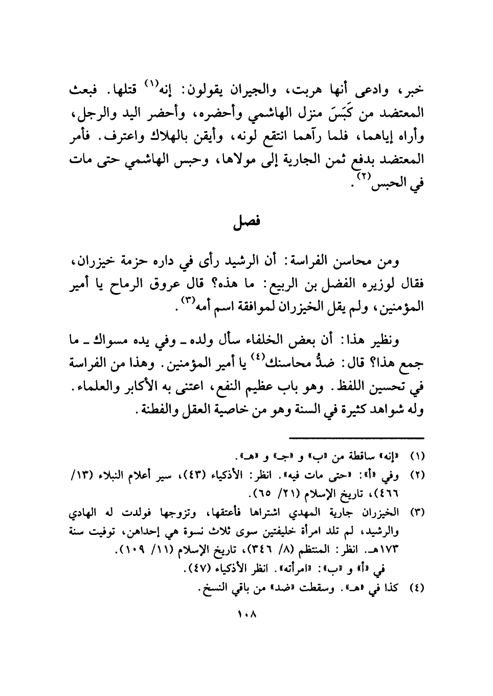 ومن محاسن الفراسة: أن الرشيد رأى في داره حزمة خيزران، فقال لوزيره الفضل بن الربيع: ما هذه؟ قال عروق الرماح يا أمير المؤمنين، ولم يقل الخيزران لموافقة اسم أمه (¬٣).