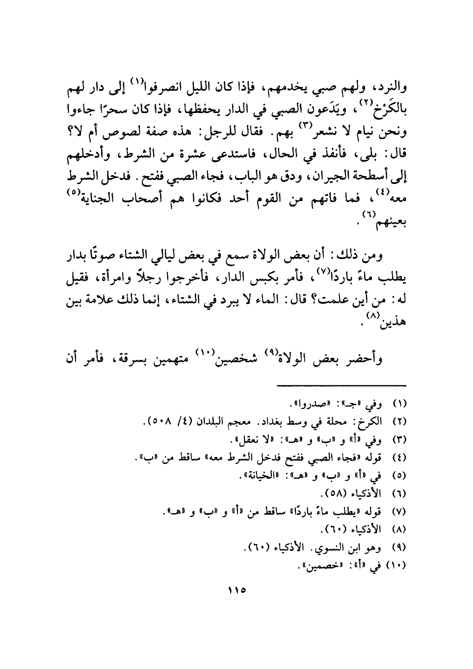 والنرد، ولهم صبي يخدمهم، فإذا كان الليل انصرفوا (¬١) إلى دار لهم بالكَرْخ (¬٢)، ويَدَعون الصبي في الدار يحفظها، فإذا كان سحرًا جاءوا ونحن نيام لا نشعر (¬٣) بهم. فقال للرجل: هذه صفة لصوص أم لا؟ قال: بلى، فأنفذ في الحال، فاستدعى عشرة من الشرط، وأدخلهم إلى أسطحة الجيران، ودق هو الباب، فجاء الصبي ففتح. فدخل الشرط معه (¬٤)، فما فاتهم من القوم أحد فكانوا هم أصحاب الجناية (¬٥) بعينهم (¬٦).