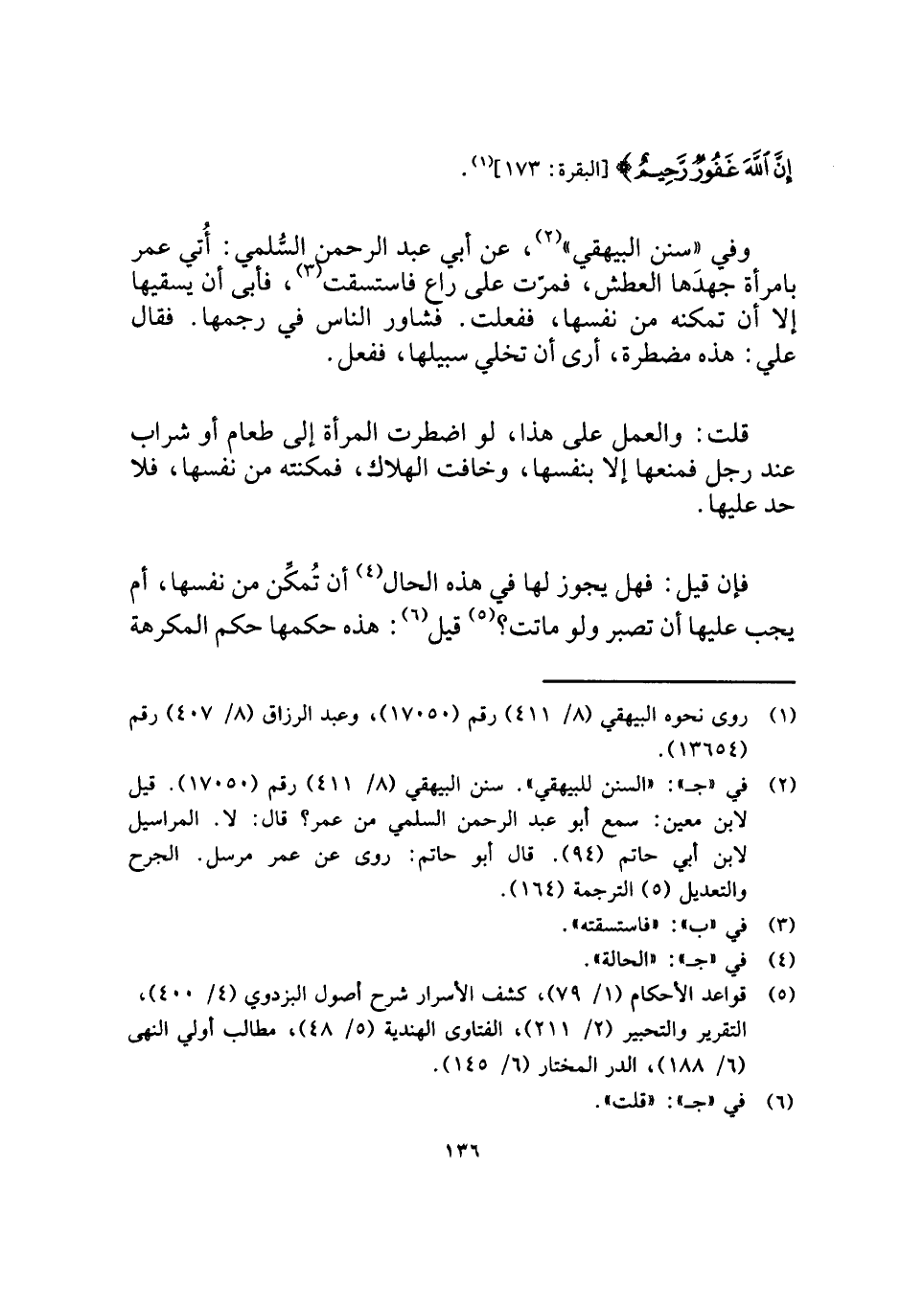 وفي "سنن البيهقي" (¬٢)، عن أبي عبد الرحمن السُّلمي: أُتي عمر بامرأة جهدَها العطش، فمرّت على راع فاستسقت (¬٣)، فأبى أن يسقيها إلا أن تمكنه من نفسها، ففعلت. فشاور الناس في رجمها. فقال علي: هذه مضطرة، أرى أن تخلي سبيلها، ففعل.