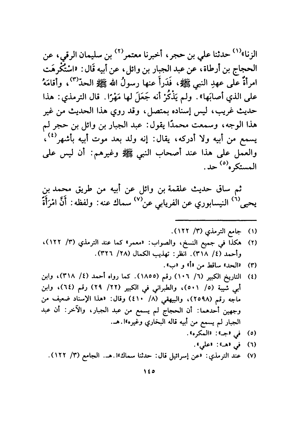 الزنا" (¬١) حدثنا علي بن حجر، أخبرنا معتمر (¬٢) بن سليمان الرقي، عن الحجاج بن أرطاة، عن عبد الجبار بن وائل، عن أبيه قَال: "اسْتُكرهَت امرأةٌ على عهدِ النبي - صلى الله عليه وسلم -، فَدَرأَ عنها رسولُ الله - صلى الله عليه وسلم - الحدّ (¬٣)، وأقامَهُ على الذي أصابَها". ولم يَذْكُرْ أنه جَعَلَ لها مَهْرًا. قال الترمذي: هذا حديث غريب، ليس إسناده بمتصل، وقد روي هذا الحديث من غير هذا الوجه، وسمعت محمدًا يقول: عبد الجبار بن وائل بن حجر لم يسمع من أبيه ولا أدركه، يقال: إنه ولد بعد موت أبيه بأشهر (¬٤)، والعمل على هذا عند أصحاب النبي - صلى الله عليه وسلم - وغيرهم: أن ليس على المستكره (¬٥) حد.