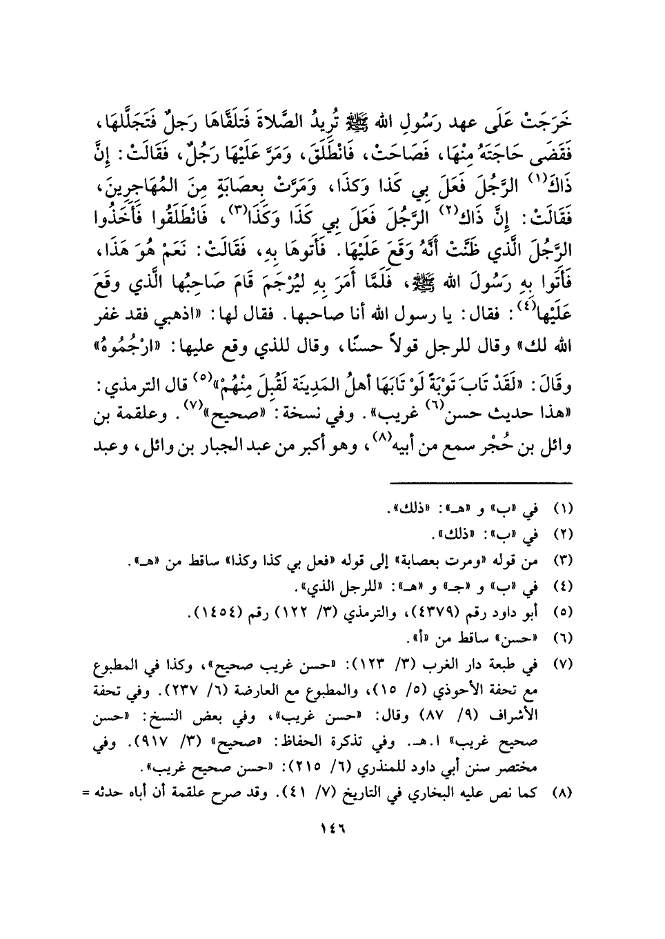 خَرَجَتْ عَلَى عهد رَسُولِ الله - صلى الله عليه وسلم - تُرِيدُ الصَّلاةَ فَتلَقَّاهَا رَجلٌ فَتَجَلَّلهَا، فَقَضَى حَاجَتَهُ مِنْهَا، فَصَاحَتْ، فَانْطَلَقَ، وَمَرَّ عَلَيْهَا رَجُلٌ، فَقَالَتْ: إِنَّ ذَاكَ (¬١) الرَّجُلَ فَعَلَ بِي كَذا وَكذَا، وَمَرَّتْ بعصَابَةٍ مِنَ المُهَاجرِينَ، فَقَالَتْ: إِنَّ ذَاك (¬٢) الرَّجُلَ فَعَلَ بِي كَذَا وَكذَا (¬٣)، فَانْطَلَقُوا فأَخَذُوا الرَّجُلَ الَّذي ظَنَّتْ أَنَّهُ وَقَعَ عَلَيْهَا. فَأَتوهَا بِهِ، فَقَالَتْ: نَعَمْ هُوَ هَذَا، فَأَتَوا بهِ رَسُولَ الله - صلى الله عليه وسلم -، فلَمَّا أَمَرَ بهِ ليُرْجَمَ قَامَ صَاحِبُها الَّذي وقَعَ عَلَيْها (¬٤): فقال: يا رسول الله أنا صاحبها. فقال لها: "اذهبي فقد غفر الله لك" وقال للرجل قولًا حسنًا، وقال للذي وقع عليها: "ارْجُمُوهُ" وقَالَ: "لَقَدْ تَابَ تَوْبَةً لَوْ تَابَهَا أهلُ المَدِينَة لَقُبِلَ مِنْهُمْ" (¬٥) قال الترمذي: "هذا حديث حسن (¬٦) غريب". وفي نسخة: "صحيح" (¬٧). وعلقمة بن وائل بن حُجْر سمع من أبيه (¬٨)، وهو أكبر من عبد الجبار بن وائل، وعبد