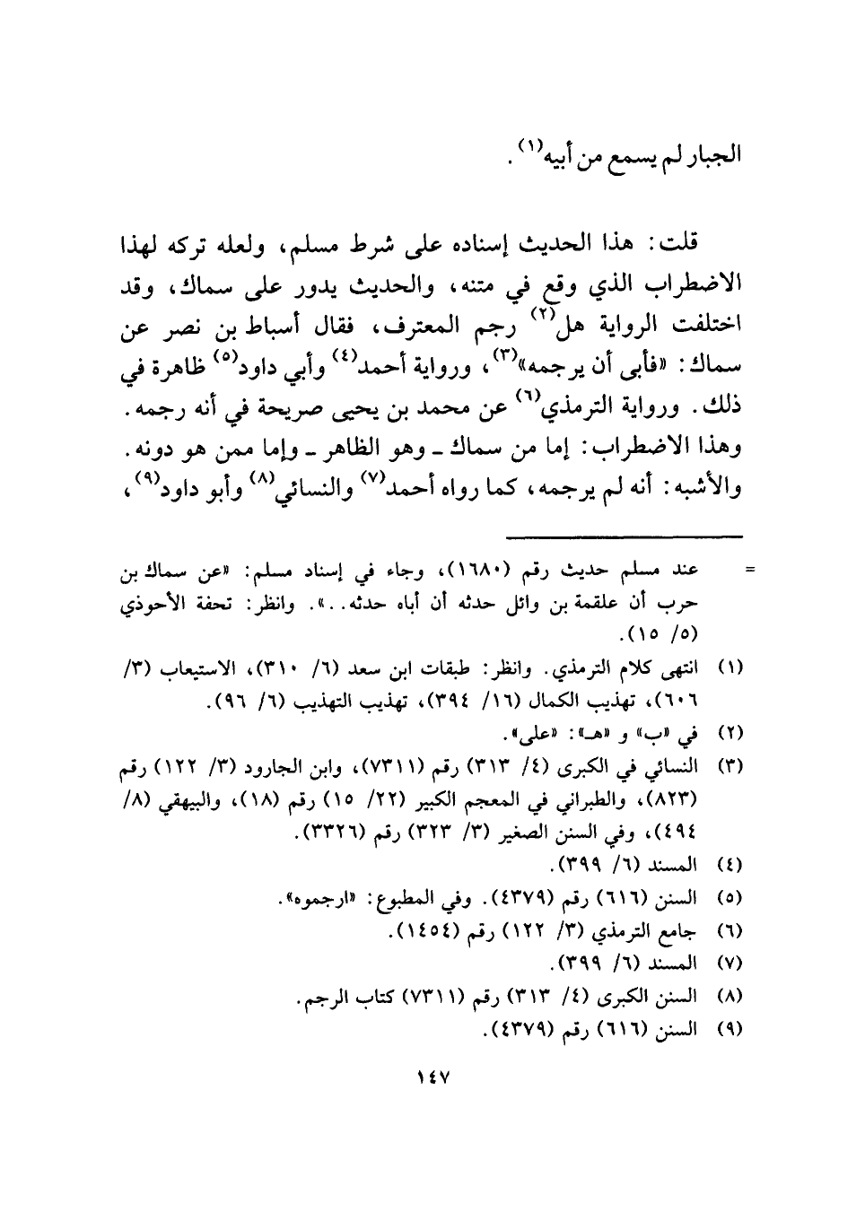 قلت: هذا الحديث إسناده على شرط مسلم، ولعله تركه لهذا الاضطراب الذي وقع في متنه، والحديث يدور على سماك، وقد اختلفت الرواية هل (¬٢) رجم المعترف، فقال أسباط بن نصر عن سماك: "فأبى أن يرجمه" (¬٣)، ورواية أحمد (¬٤) وأبي داود (¬٥) ظاهرة في ذلك. ورواية الترمذي (¬٦) عن محمد بن يحيى صريحة في أنه رجمه. وهذا الاضطراب: إما من سماك - وهو الظاهر - وإما ممن هو دونه. والأشبه: أنه لم يرجمه، كما رواه أحمد (¬٧) والنسائي (¬٨) وأبو داود (¬٩)،