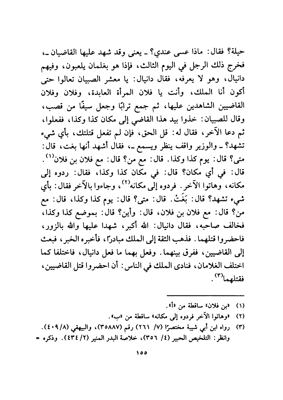 حيلة؟ فقال: ماذا عسى عندي؟ - يعنى وقد شهد عليها القاضيان -، فخرج ذلك الرجل في اليوم الثالث، فإذا هو بغلمان يلعبون، وفيهم دانيال، وهو لا يعرفه، فقال دانيال: يا معشر الصبيان تعالوا حتى أكون أنا الملك، وأنت يا فلان المرأة العابدة، وفلان وفلان القاضيين الشاهدين عليها، ثم جمع ترابًا وجعل سيفًا من قصب، وقال للصبيان: خذوا بيد هذا القاضي إلى مكان كذا وكذا، ففعلوا، ثم دعا الآخر، فقال له: قل الحق، فإن لم تفعل قتلتك، بأي شيء تشهد؟ - والوزير واقف ينظر ويسمع -، فقال أشهد أنها بغت، قال: متى؟ قال: يوم كذا وكذا. قال: مع من؟ قال: مع فلان بن فلان (¬١). قال: في أي مكان؟ قال: في مكان كذا وكذا، فقال: ردوه إلى مكانه، وهاتوا الآخر. فردوه إلى مكانه (¬٢)، وجاءوا بالآخر فقال: بأي شيء تشهد؟ قال: بَغَتْ. قال: متى؟ قال: يوم كذا وكذا، قال: مع من؟ قال: مع فلان بن فلان، قال: وأين؟ قال: بموضع كذا وكذا، فخالف صاحبه، فقال دانيال: الله أكبر، شهدا عليها والله بالزور، فاحضروا قتلهما. فذهب الثقة إلى الملك مبادرًا، فأخبره الخبر، فبعث إلى القاضيين، ففرق بينهما. وفعل بهما ما فعل دانيال، فاختلفا كما اختلف الغلامان، فنادى الملك في الناس: أن احضروا قتل القاضيين، فقتلهما (¬٣).