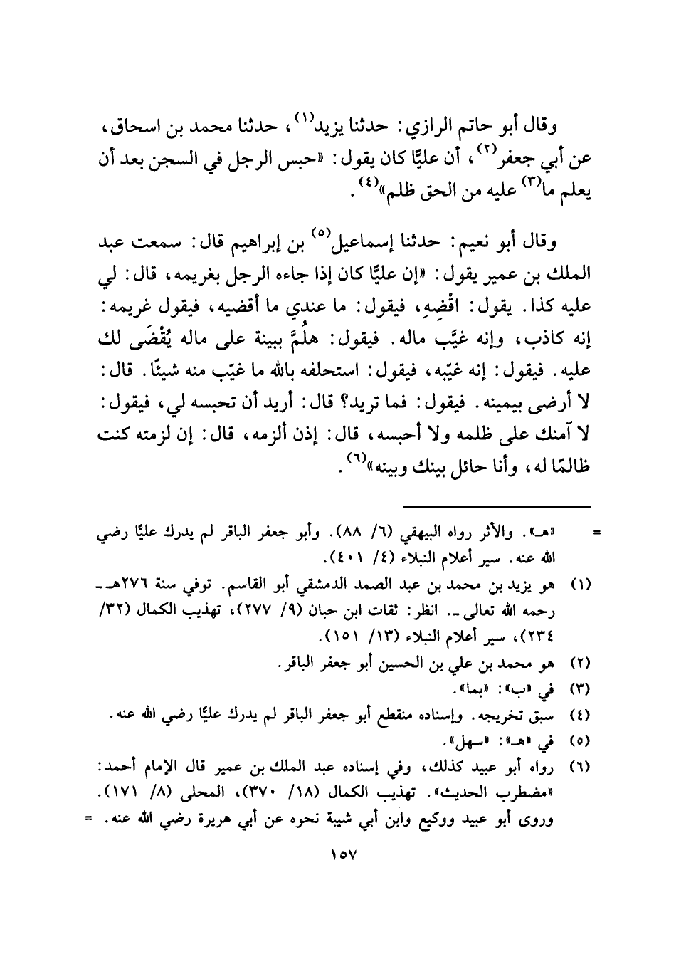 وقال أبو حاتم الرازي: حدثنا يزيد (¬١)، حدثنا محمد بن إسحاق، عن أبي جعفر (¬٢)، أن عليًّا كان يقول: "حبس الرجل في السجن بعد أن يعلم ما (¬٣) عليه من الحق ظلم" (¬٤).
