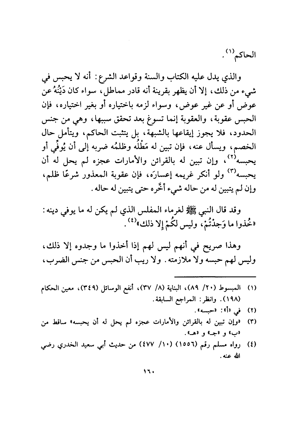 (¬٣) "وإن تبين له بالقرائن والأمارات عجزه لم يحل له أن يحبسه" ساقط من "ب" و"جـ" و"هـ".