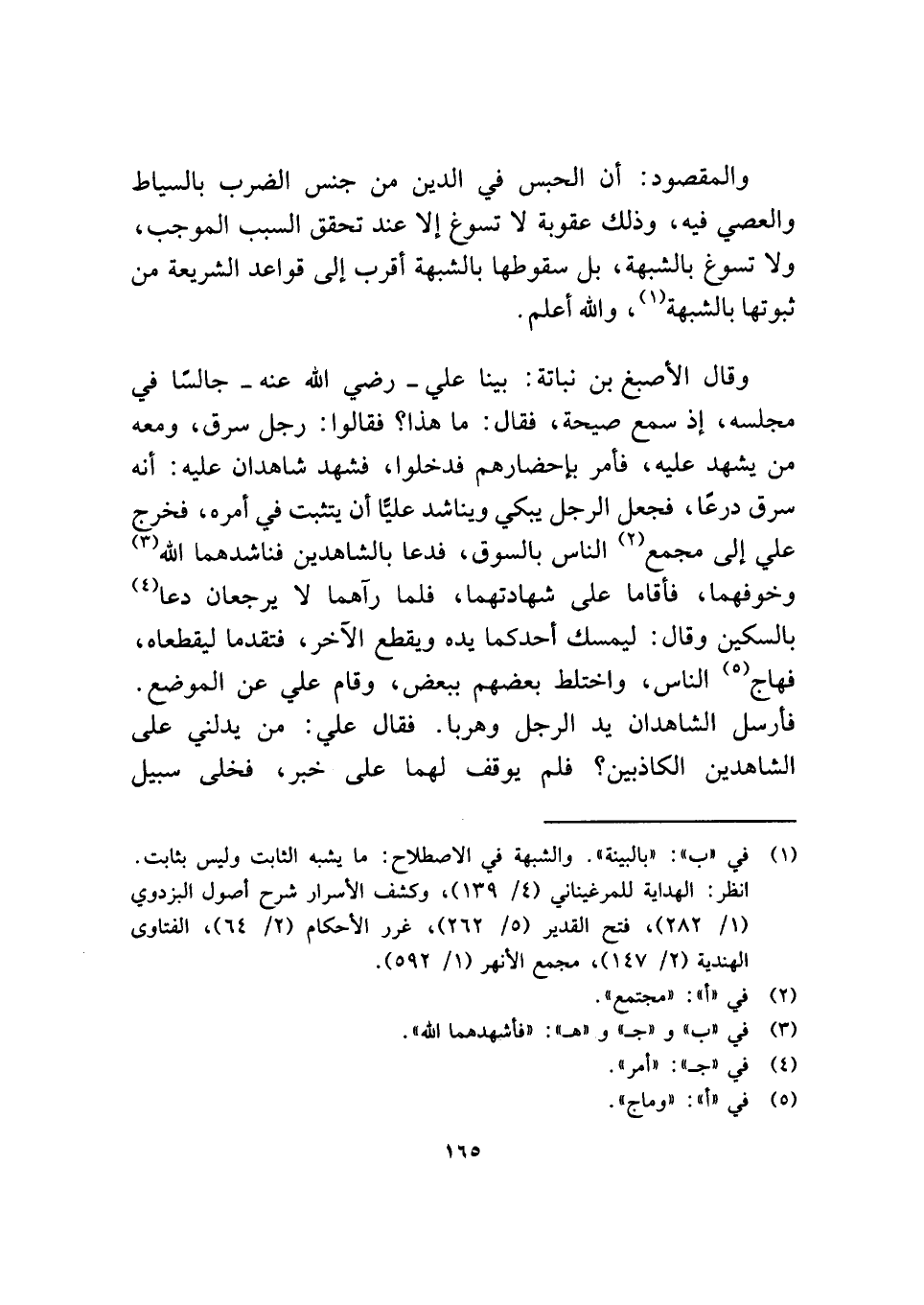 والمقصود: أن الحبس في الدين من جنس الضرب بالسياط والعصي فيه، وذلك عقوبة لا تسوغ إلا عند تحقق السبب الموجب، ولا تسوغ بالشبهة، بل سقوطها بالشبهة أقرب إلى قواعد الشريعة من ثبوتها بالشبهة (¬١)، والله أعلم.