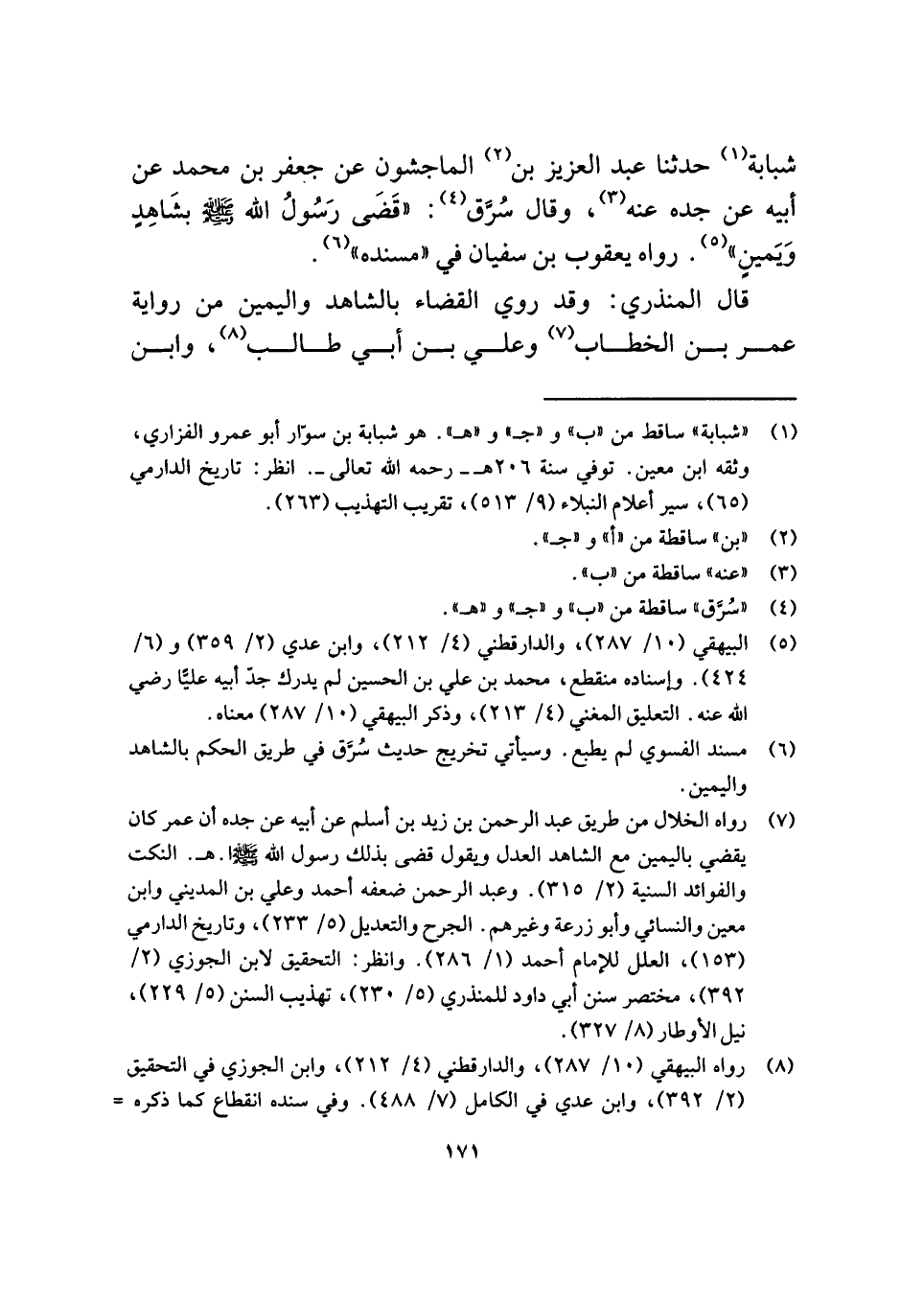 (¬٧) رواه الخلال من طريق عبد الرحمن بن زيد بن أسلم عن أبيه عن جده أن عمر كان يقضي باليمين مع الشاهد العدل ويقول قضى بذلك رسول الله - صلى الله عليه وسلم - ا. هـ. النكت والفوائد السنية (٢/ ٣١٥). وعبد الرحمن ضعفه أحمد وعلي بن المديني وابن معين والنسائي وأبو زرعة وغيرهم. الجرح والتعديل (٥/ ٢٣٣)، وتاريخ الدارمي (١٥٣)، العلل للإمام أحمد (١/ ٢٨٦). وانظر: التحقيق لابن الجوزي (٢/ ٣٩٢)، مختصر سنن أبي داود للمنذري (٥/ ٢٣٠)، تهذيب السنن (٥/ ٢٢٩)، نيل الأوطار (٨/ ٣٢٧).