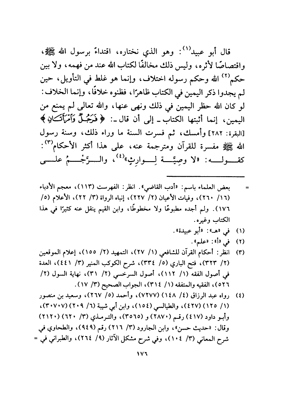 قال أبو عبيد (¬١): وهو الذي نختاره، اقتداءً برسول الله - صلى الله عليه وسلم -، واقتصاصًا لأثره، وليس ذلك مخالفًا لكتاب الله عند من فهمه، ولا بين حكم (¬٢) الله وحكم رسوله اختلاف، وإنما هو غلط في التأويل، حين لم يجدوا ذكر اليمين في الكتاب ظاهرًا، فظنوه خلافًا، وإنما الخلاف: لو كان الله حظر اليمين في ذلك ونهى عنها، والله تعالى لم يمنع من اليمين، إنما أثبتها الكتاب - إلى أن قال -: {فَرَجُلٌ وَامْرَأَتَانِ} [البقرة: ٢٨٢] وأمسك، ثم فسرت السنة ما وراء ذلك، وسنة رسول الله - صلى الله عليه وسلم - مفسرة للقرآن ومترجمة عنه، على هذا أكثر الأحكام (¬٣): كقوله: "لا وصِيَّة لِوارِثٍ" (¬٤)، والرَّجْمُ على