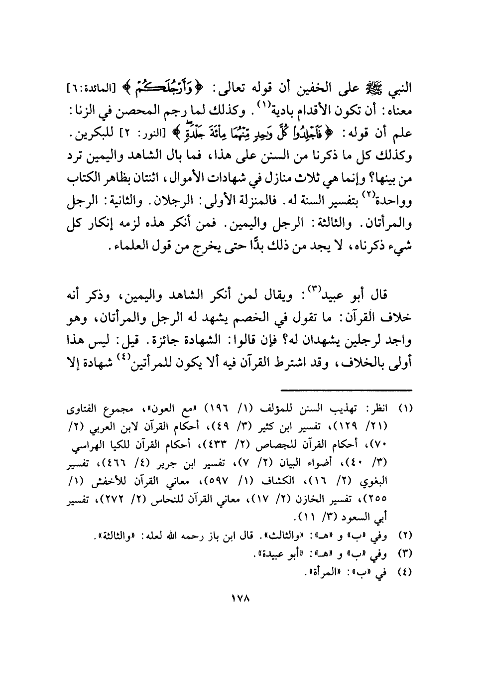 النبي - صلى الله عليه وسلم - على الخفين أن قوله تعالى: {وَأَرْجُلَكُمْ} [المائدة: ٦] معناه: أن تكون الأقدام بادية (¬١). وكذلك لما رجم المحصن في الزنا: علم أن قوله: {فَاجْلِدُوا كُلَّ وَاحِدٍ مِنْهُمَا مِائَةَ جَلْدَةٍ} [النور: ٢] للبكرين. وكذلك كل ما ذكرنا من السنن على هذا، فما بال الشاهد واليمين ترد من بينها؟ وإنما هي ثلاث منازل في شهادات الأموال، اثنتان بظاهر الكتاب وواحدة (¬٢) بتفسير السنة له. فالمنزلة الأولى: الرجلان. والثانية: الرجل والمرأتان. والثالثة: الرجل واليمين. فمن أنكر هذه لزمه إنكار كل شيء ذكرناه، لا يجد من ذلك بدًّا حتى يخرج من قول العلماء.