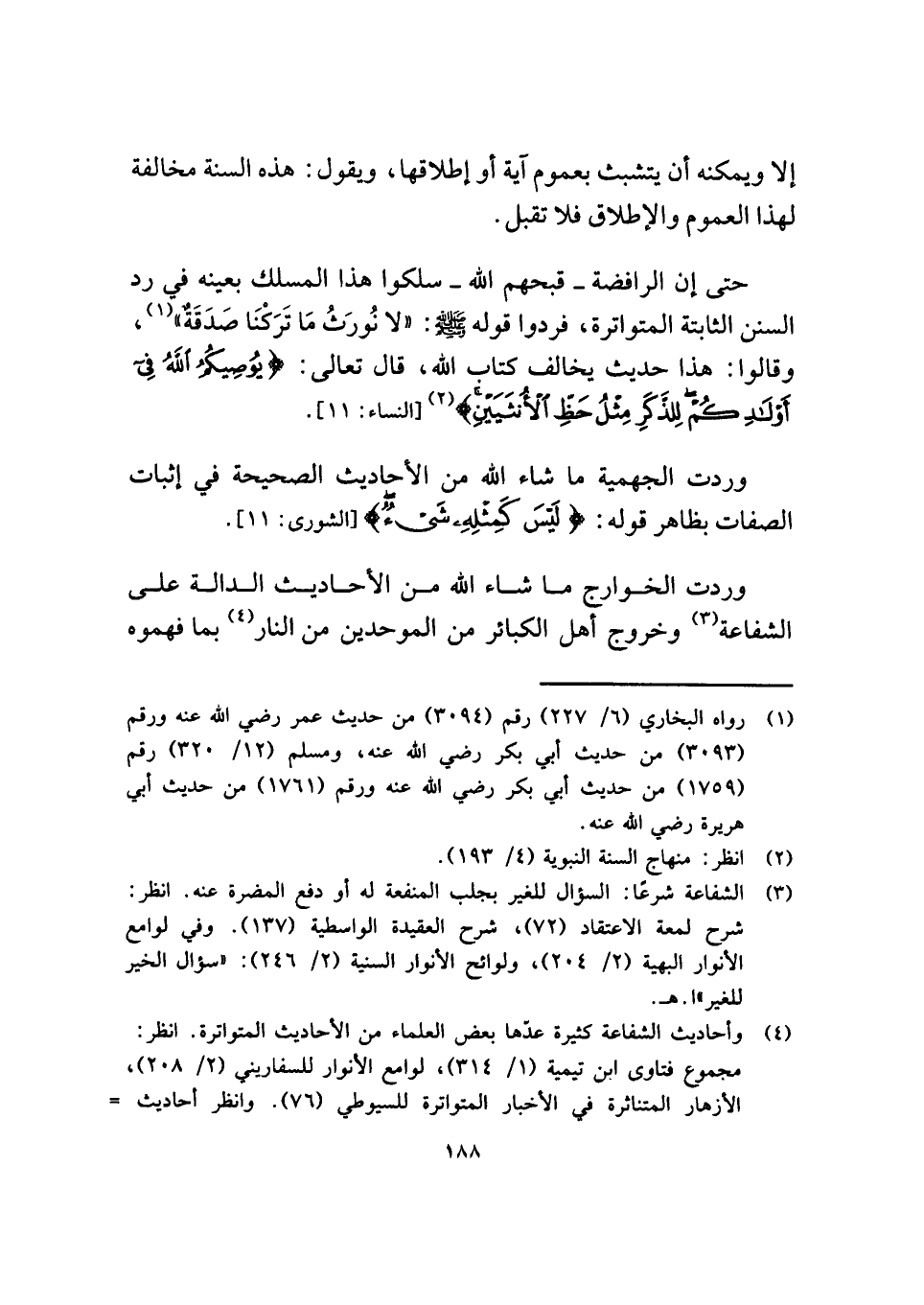 حتى إن الرافضة - قبحهم الله - سلكوا هذا المسلك بعينه في رد السنن الثابتة المتواترة، فردوا قوله - صلى الله عليه وسلم -: "لا نُورَثُ مَا تَرَكْنَا صَدَقَةٌ" (¬١)، وقالوا: هذا حديث يخالف كتاب الله، قال تعالى: {يُوصِيكُمُ اللَّهُ فِي أَوْلَادِكُمْ لِلذَّكَرِ مِثْلُ حَظِّ الْأُنْثَيَيْنِ} (¬٢) [النساء: ١١].
