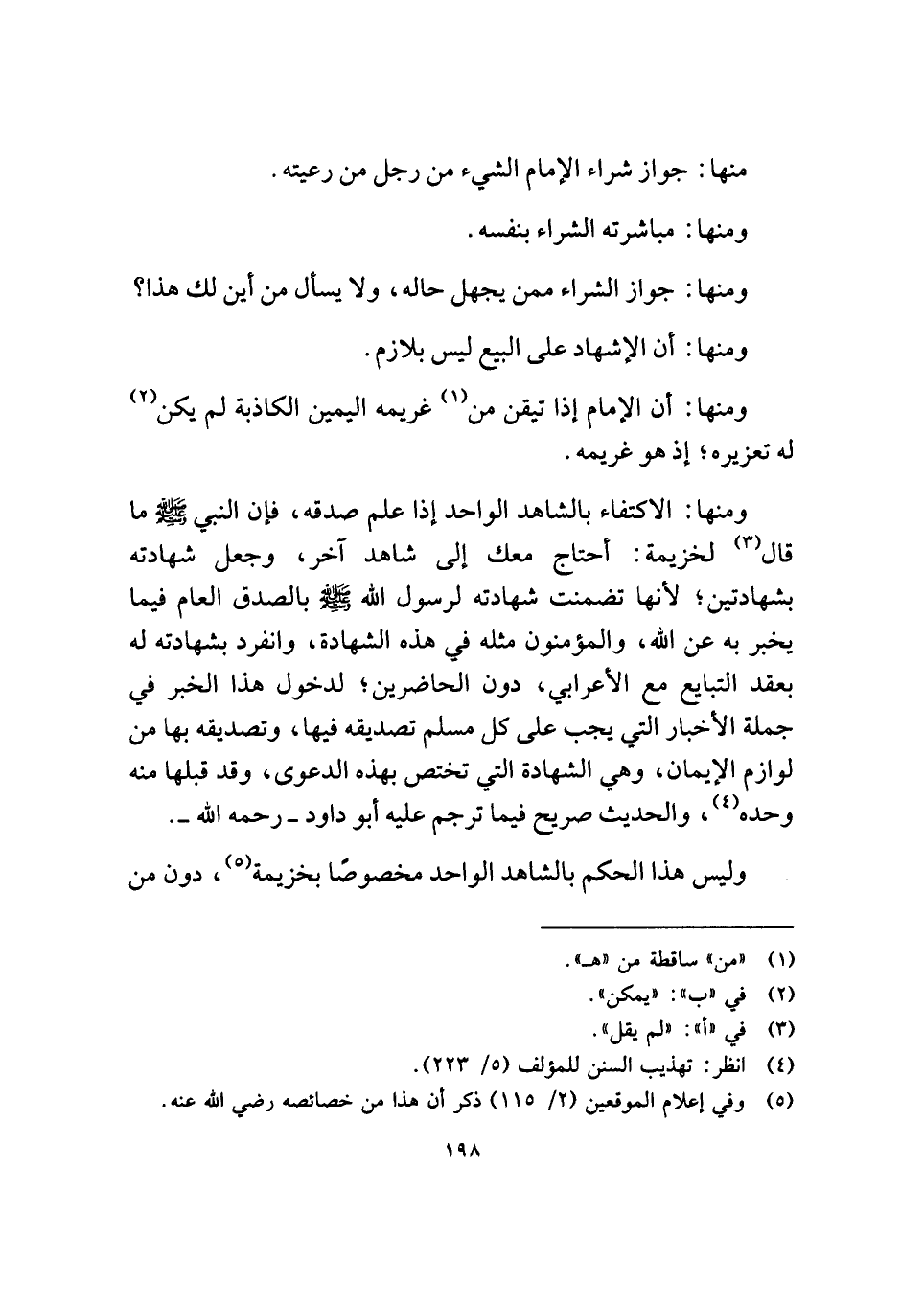 ومنها: الاكتفاء بالشاهد الواحد إذا علم صدقه، فإن النبي - صلى الله عليه وسلم - ما قال (¬٣) لخزيمة: أحتاج معك إلى شاهد آخر، وجعل شهادته بشهادتين؛ لأنها تضمنت شهادته لرسول الله - صلى الله عليه وسلم - بالصدق العام فيما يخبر به عن الله، والمؤمنون مثله في هذه الشهادة، وانفرد بشهادته له بعقد التبايع مع الأعرابي، دون الحاضرين؛ لدخول هذا الخبر في جملة الأخبار التي يجب على كل مسلم تصديقه فيها، وتصديقه بها من لوازم الإيمان، وهي الشهادة التي تختص بهذه الدعوى، وقد قبلها منه وحده (¬٤)، والحديث صريح فيما ترجم عليه أبو داود - رحمه الله -.