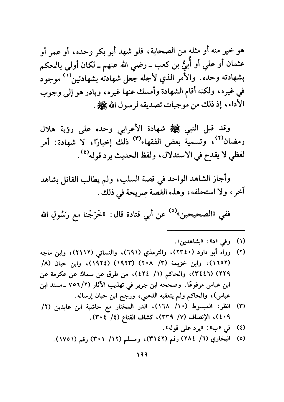 وقد قبل النبي - صلى الله عليه وسلم - شهادة الأعرابي وحده على رؤية هلال رمضان (¬٢)، وتسمية بعض الفقهاء (¬٣) ذلك إخبارًا، لا شهادة: أمر لفظي لا يقدح في الاستدلال، ولفظ الحديث يرد قوله (¬٤).