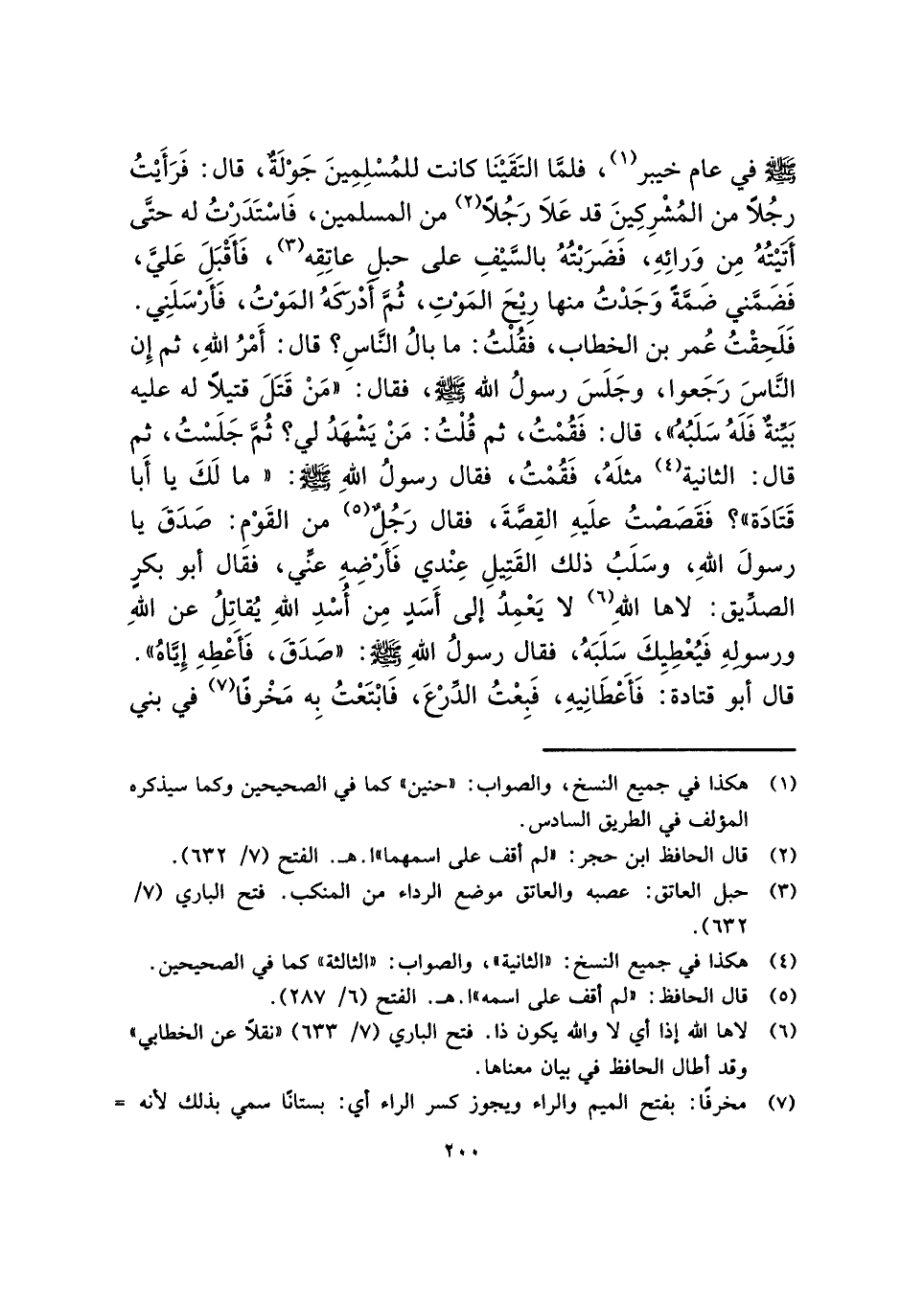 - صلى الله عليه وسلم - في عام خيبر (¬١)، فلمَّا التَقَيْنَا كانت للمُسْلِمِينَ جَوْلَةٌ، قال: فَرَأَيْتُ رجُلًا من المُشْرِكِينَ قد عَلَا رَجُلًا (¬٢) من المسلمين، فَاسْتَدَرْتُ له حتَّى أَتَيْتُهُ مِن وَرائِهِ، فضَرَبْتُهُ بالسَّيْفِ على حبل عاتِقِه (¬٣)، فَأَقْبَلَ عَليَّ، فَضَمَّني ضَمَّةً وَجَدْتُ منها رِيْحَ المَوْتِ، ثُمَّ أَدْركَهُ المَوْتُ، فَأرْسَلَنِي. فَلَحِقْتُ عُمر بن الخطاب، فقُلْتُ: ما بالُ النَّاسِ؟ قال: أَمْرُ اللهِ، ثم إِن النَّاسَ رَجَعوا، وجَلَسَ رسولُ الله - صلى الله عليه وسلم -، فقال: "مَنْ قَتَلَ قتيلًا له عليه بَيِّنةٌ فَلَهُ سَلَبُهُ"، قال: فقُمْتُ، ثم قُلْتُ: مَنْ يَشْهَدُ لي؟ ثُمَّ جَلَسْتُ، ثم قال: الثانية (¬٤) مثلَهُ، فَقُمْتُ، فقال رسولُ اللهِ - صلى الله عليه وسلم -: "ما لَكَ يا أَبا قَتَادَة"؟ فَقَصَصْتُ علَيهِ القِصَّةَ، فقال رَجُلٌ (¬٥) من القَوْمِ: صَدَقَ يا رسولَ اللهِ، وسَلَبُ ذلك القَتِيلِ عِنْدي فَأَرْضِهِ عنِّي، فقال أبو بكرٍ الصدِّيق: لاها اللهِ (¬٦) لا يَعْمِدُ إلى أَسَدٍ مِن أُسْدِ اللهِ يُقاتِلُ عن اللهِ ورسولِهِ فَيُعْطِيكَ سَلَبَهُ، فقال رسولُ اللهِ - صلى الله عليه وسلم -: "صَدَقَ، فَأَعْطِهِ إِيَّاهُ". قال أبو قتادة: فَأَعْطَانِيهِ، فَبِعْتُ الدِّرْعَ، فَابْتَعْتُ بِه مَخْرفًا (¬٧) في بني