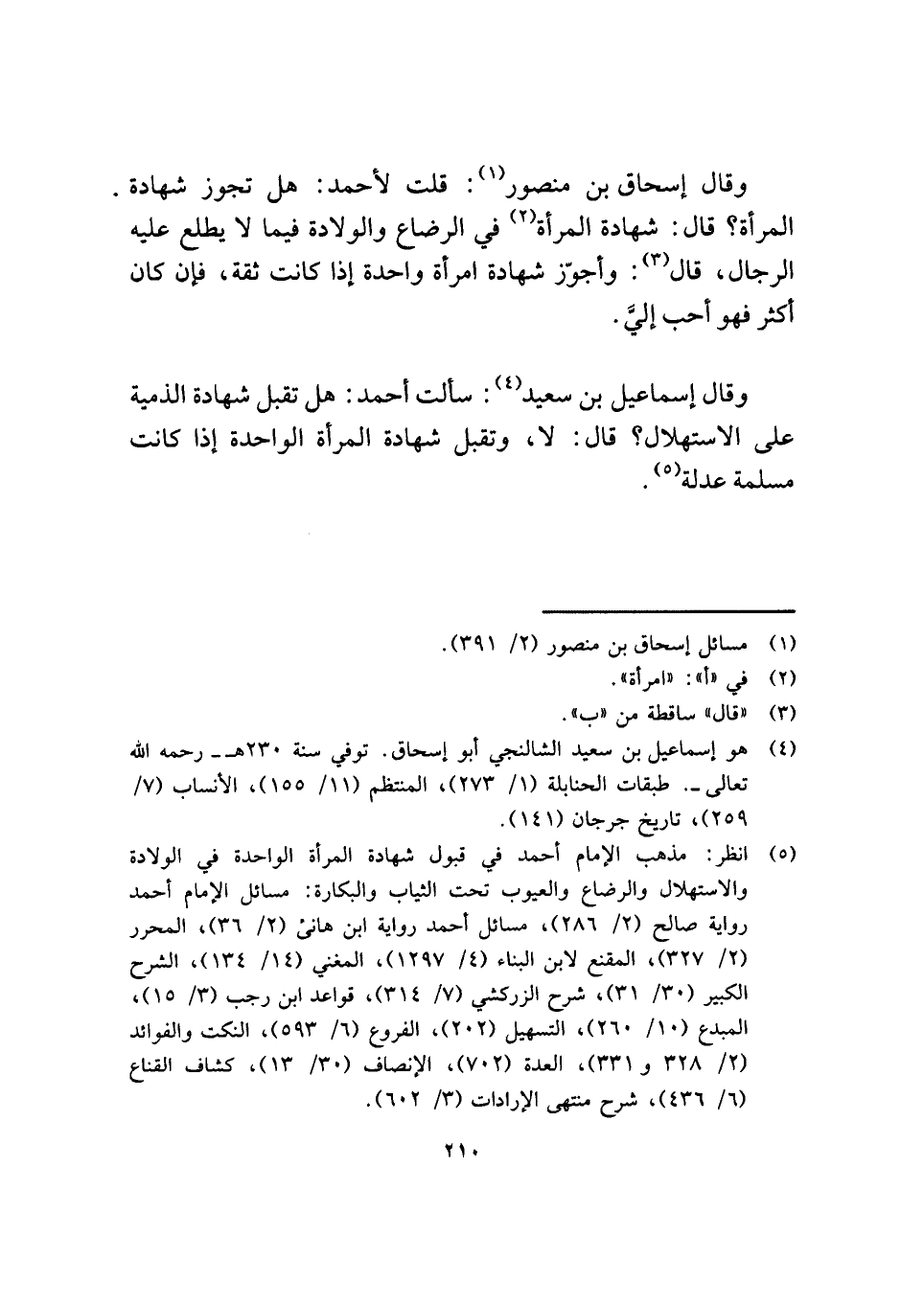 (¬٥) انظر: مذهب الإمام أحمد في قبول شهادة المرأة الواحدة في الولادة والاستهلال والرضاع والعيوب تحت الثياب والبكارة: مسائل الإمام أحمد رواية صالح (٢/ ٢٨٦)، مسائل أحمد رواية ابن هانئ (٢/ ٣٦)، المحرر (٢/ ٣٢٧)، المقنع لابن البناء (٤/ ١٢٩٧)، المغني (١٤/ ١٣٤)، الشرح الكبير (٣٠/ ٣١)، شرح الزركشي (٧/ ٣١٤)، قواعد ابن رجب (٣/ ١٥)، المبدع (١٠/ ٢٦٠)، التسهيل (٢٠٢)، الفروع (٦/ ٥٩٣)، النكت والفوائد (٢/ ٣٢٨ و ٣٣١)، العدة (٧٠٢)، الإنصاف (٣٠/ ١٣)، كشاف القناع (٦/ ٤٣٦)، شرح منتهى الإرادات (٣/ ٦٠٢).