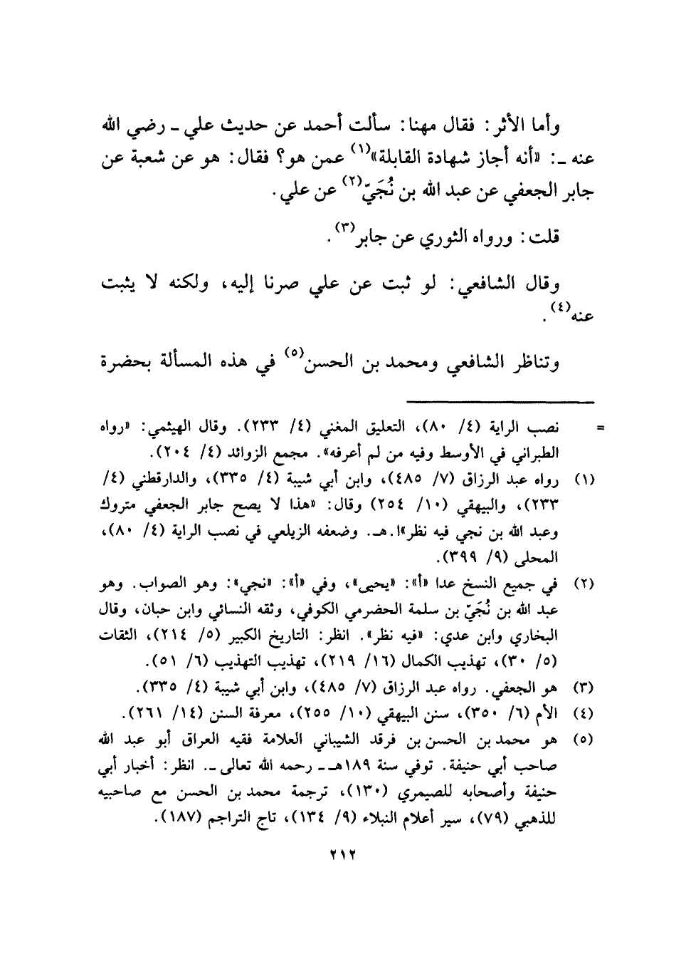 وأما الأثر: فقال مهنا: سألت أحمد عن حديث علي - رضي الله عنه -: "أنه أجاز شهادة القابلة" (¬١) عمن هو؟ فقال: هو عن شعبة عن جابر الجعفي عن عبد الله بن نُجَيّ (¬٢) عن علي.