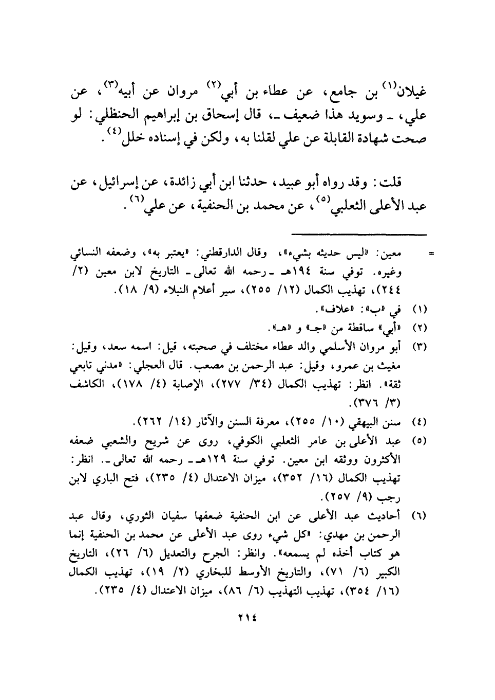 (¬٦) أحاديث عبد الأعلى عن ابن الحنفية ضعفها سفيان الثوري، وقال عبد الرحمن بن مهدي: "كل شيء روى عبد الأعلى عن محمد بن الحنفية إنما هو كتاب أخذه لم يسمعه". وانظر: الجرح والتعديل (٦/ ٢٦)، التاريخ الكبير (٦/ ٧١)، والتاريخ الأوسط للبخاري (٢/ ١٩)، تهذيب الكمال (١٦/ ٣٥٤)، تهذيب التهذيب (٦/ ٨٦)، ميزان الاعتدال (٤/ ٢٣٥).