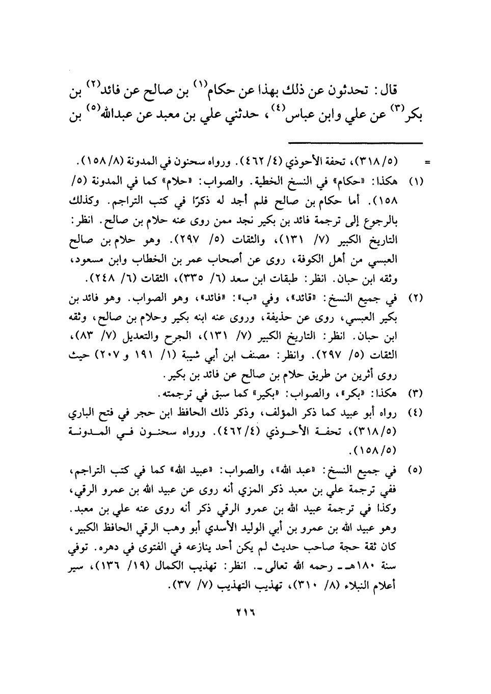 قال: تحدثون عن ذلك بهذا عن حكام (¬١) بن صالح عن فائد (¬٢) بن بكر (¬٣) عن علي وابن عباس (¬٤)، حدثني علي بن معبد عن عبد الله (¬٥) بن