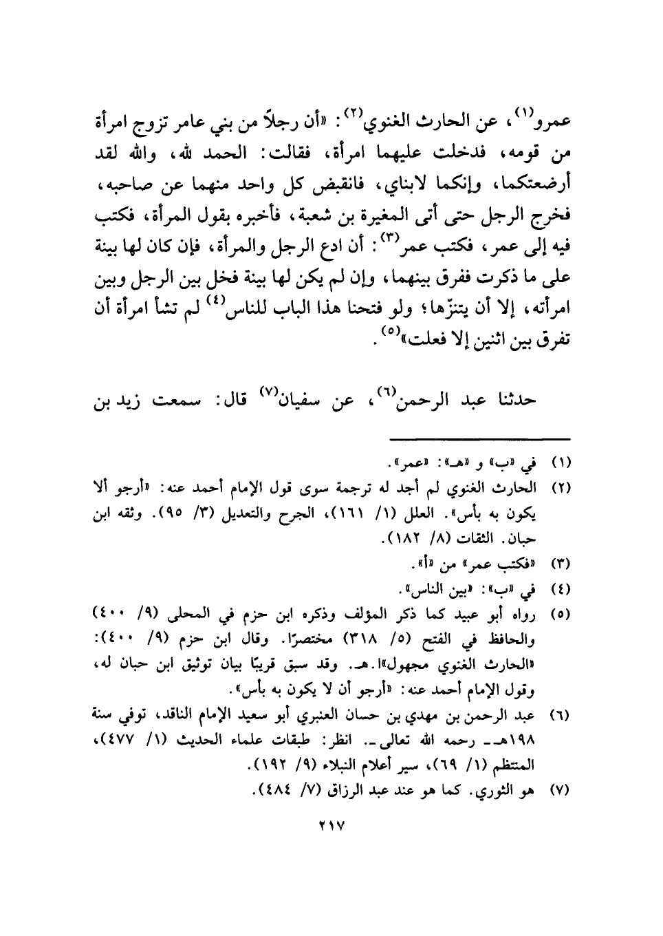 (¬٥) رواه أبو عبيد كما ذكر المؤلف وذكره ابن حزم في المحلى (٩/ ٤٠٠) والحافظ في الفتح (٥/ ٣١٨) مختصرًا. وقال ابن حزم (٩/ ٤٠٠): "الحارث الغنوي مجهول" ا. هـ. وقد سبق قريبًا بيان توثيق ابن حبان له، وقول الإمام أحمد عنه: "أرجو أن لا يكون به بأس".