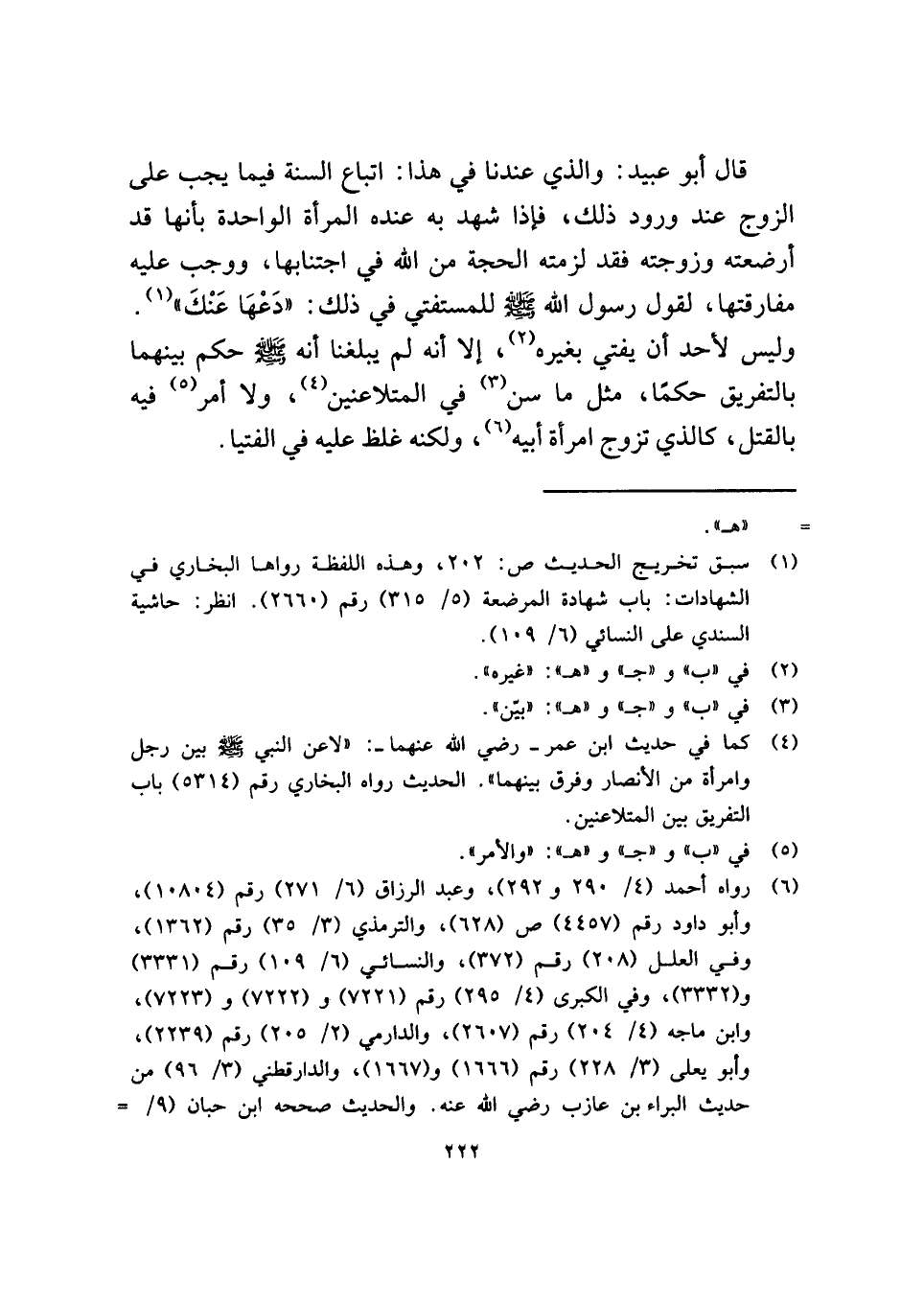 قال أبو عبيد: والذي عندنا في هذا: اتباع السنة فيما يجب على الزوج عند ورود ذلك، فإذا شهد به عنده المرأة الواحدة بأنها قد أرضعته وزوجته فقد لزمته الحجة من الله في اجتنابها، ووجب عليه مفارقتها، لقول رسول الله - صلى الله عليه وسلم - للمستفتي في ذلك: "دَعْهَا عَنْكَ" (¬١). وليس لأحد أن يفتي بغيره (¬٢)، إلا أنه لم يبلغنا أنه - صلى الله عليه وسلم - حكم بينهما بالتفريق حكمًا، مثل ما سن (¬٣) في المتلاعنين (¬٤)، ولا أمر (¬٥) فيه بالقتل، كالذي تزوج امرأة أبيه (¬٦)، ولكنه غلظ عليه في الفتيا.
