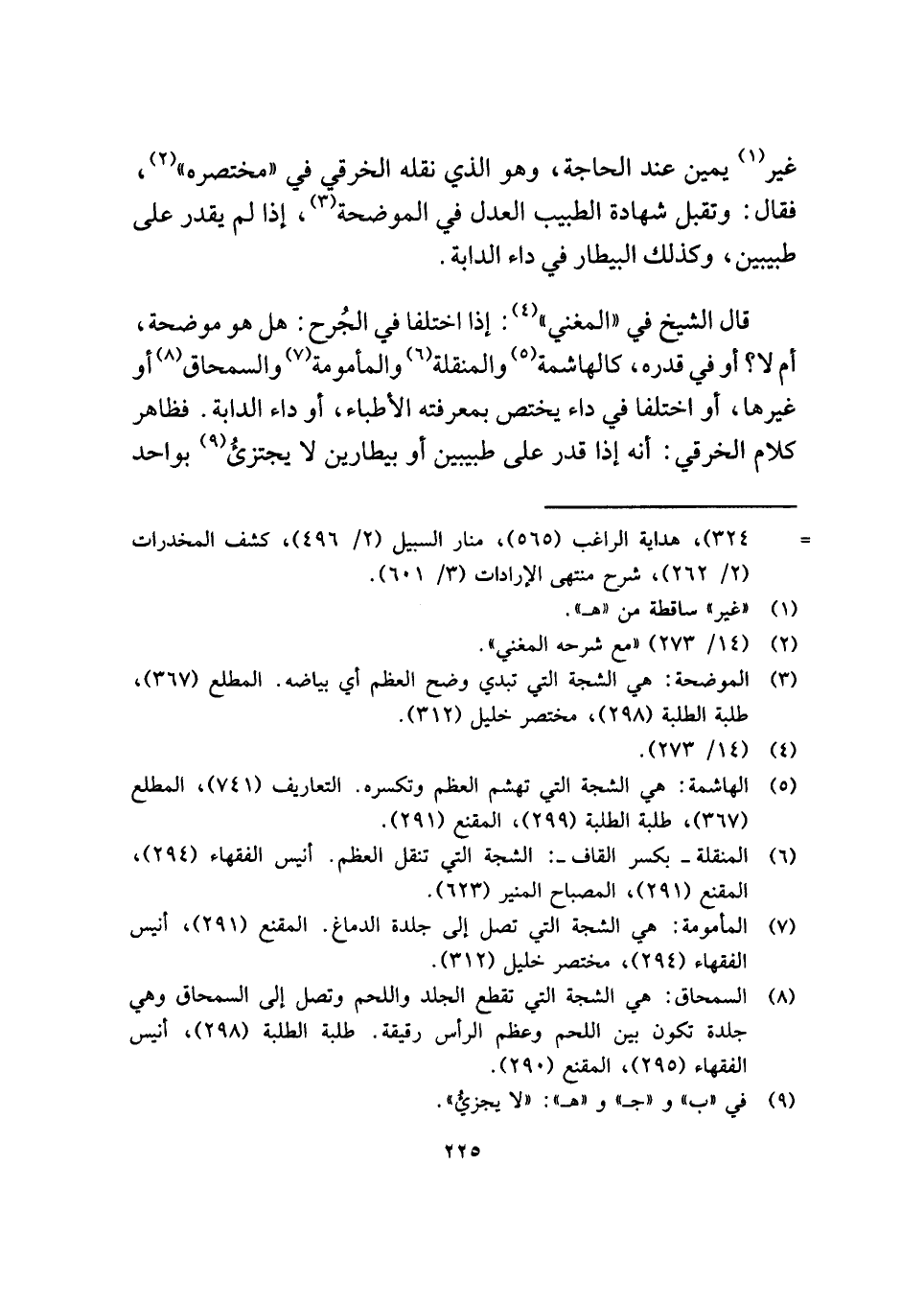 قال الشيخ في "المغني" (¬٤): إذا اختلفا في الجُرح: هل هو موضحة، أم لا؟ أو في قدره، كالهاشمة (¬٥) والمنقلة (¬٦) والمأمومة (¬٧) والسمحاق (¬٨) أو غيرها، أو اختلفا في داء يختص بمعرفته الأطباء، أو داء الدابة. فظاهر كلام الخرقي: أنه إذا قدر على طبيبين أو بيطارين لا يجتزئُ (¬٩) بواحد