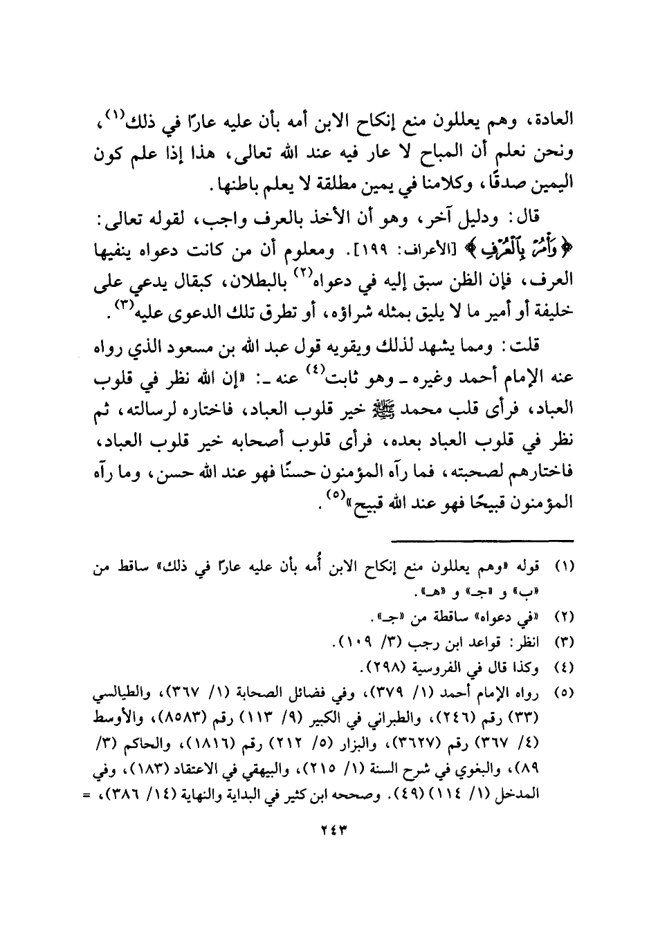 قلت: ومما يشهد لذلك ويقويه قول عبد الله بن مسعود الذي رواه عنه الإمام أحمد وغيره - وهو ثابت (¬٤) عنه -: "إن الله نظر في قلوب العباد، فرأى قلب محمد - صلى الله عليه وسلم - خير قلوب العباد، فاختاره لرسالته، ثم نظر في قلوب العباد بعده، فرأى قلوب أصحابه خير قلوب العباد، فاختارهم لصحبته، فما رآه المؤمنون حسنًا فهو عند الله حسن، وما رآه المؤمنون قبيحًا فهو عند الله قبيح" (¬٥).