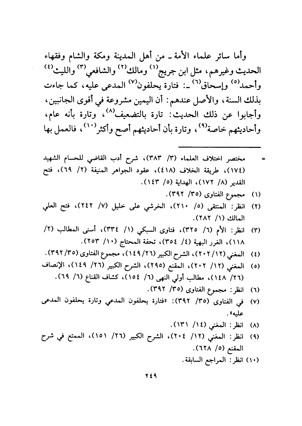 وأما سائر علماء الأمة - من أهل المدينة ومكة والشام وفقهاء الحديث وغيرهم، مثل ابن جريج (¬١) ومالك (¬٢) والشافعي (¬٣) والليث (¬٤) وأحمد (¬٥) وإسحاق (¬٦) -: فتارة يحلفون (¬٧) المدعى عليه، كما جاءت بذلك السنة، والأصل عندهم: أن اليمين مشروعة في أقوى الجانبين، وأجابوا عن ذلك الحديث: تارة بالتضعيف (¬٨)، وتارة بأنه عام، وأحاديثهم خاصة (¬٩)، وتارة بأن أحاديثهم أصح وأكثر (¬١٠)، فالعمل بها