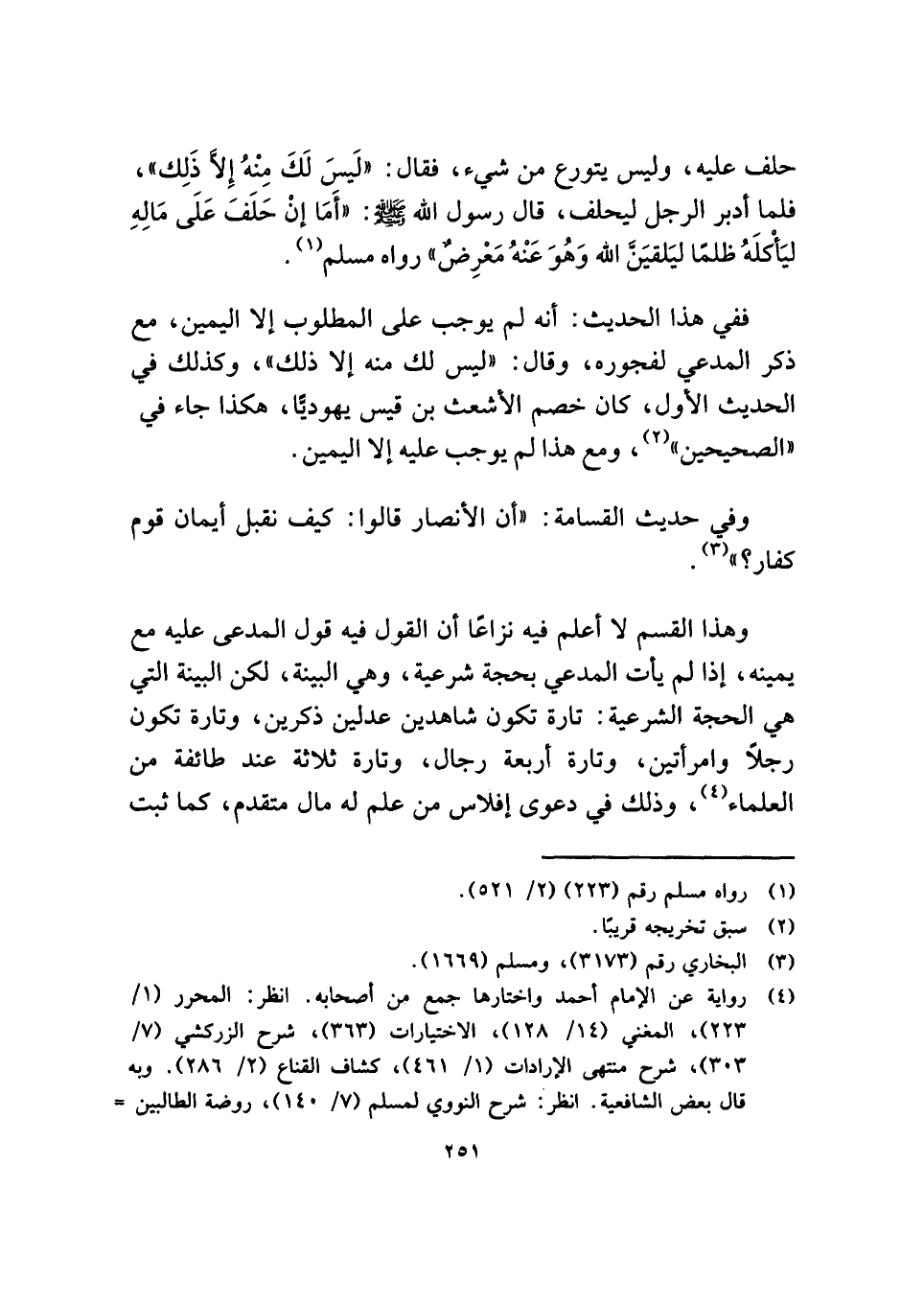 وهذا القسم لا أعلم فيه نزاعًا أن القول فيه قول المدعى عليه مع يمينه، إذا لم يأت المدعي بحجة شرعية، وهي البينة، لكن البينة التي هي الحجة الشرعية: تارة تكون شاهدين عدلين ذكرين، وتارة تكون رجلًا وامرأتين، وتارة أربعة رجال، وتارة ثلاثة عند طائفة من العلماء (¬٤)، وذلك في دعوى إفلاس من علم له مال متقدم، كما ثبت