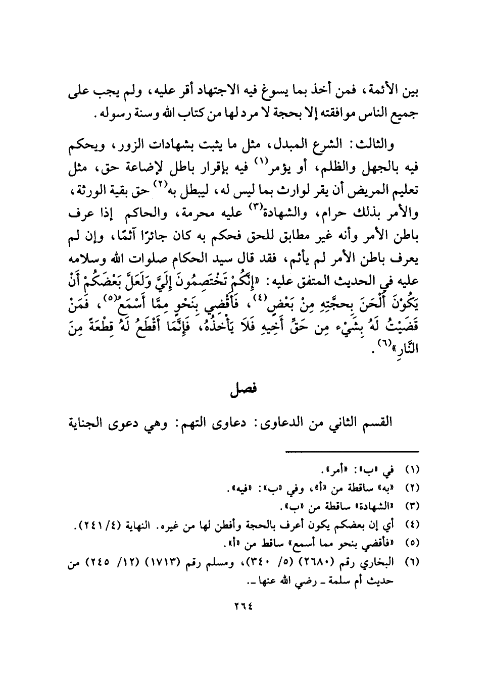 والثالث: الشرع المبدل، مثل ما يثبت بشهادات الزور، ويحكم فيه بالجهل والظلم، أو يؤمر (¬١) فيه بإقرار باطل لإضاعة حق، مثل تعليم المريض أن يقر لوارث بما ليس له، ليبطل به (¬٢) حق بقية الورثة، والأمر بذلك حرام، والشهادة (¬٣) عليه محرمة، والحاكم إذا عرف باطن الأمر وأنه غير مطابق للحق فحكم به كان جائرًا آثمًا، وإن لم يعرف باطن الأمر لم يأثم، فقد قال سيد الحكام صلوات الله وسلامه عليه في الحديث المتفق عليه: "إِنَّكُمْ تَخْتَصِمُونَ إِلَيَّ وَلَعَلَّ بَعْضَكُم أَنْ يَكُوْنَ أُلْحَنَ بِحجَّتِهِ مِنْ بَعْضٍ (¬٤)، فَأَقْضِي بنَحْوٍ مِمَّا أَسْمَعُ (¬٥)، فمَنْ قَضَيْتُ لَهُ بِشيْء مِن حَقِّ أَخِيهِ فَلَا يَأْخْذُهُ، فَإِنَّمَا أَقْطَعُ لهُ قِطْعَةً مِنَ النَّارِ" (¬٦).
