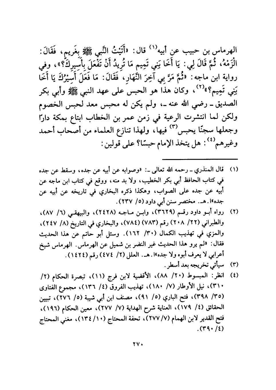 الهرماس بن حبيب عن أبيه (¬١) قال: "أَتَيْتُ النَّبي - صلى الله عليه وسلم - بِغَريمٍ، فَقَالَ: الْزَمْهُ، ثُمَّ قَالَ لِي: يَا أَخَا بَنِي تَمِيم مَا تُرِيدُ أَنْ تَفْعَلَ بِأسِيرِكَ؟ "، وفي رواية ابن ماجه: "ثُمَّ مَرَّ بِي آخِرَ النَّهَارِ، فَقَالَ: مَا فَعَلَ أَسِيْرُكَ يَا أَخَا بَنِي تَمِيم؟ " (¬٢)، وكان هذا هو الحبس على عهد النبي - صلى الله عليه وسلم - وأبي بكر الصديق - رضي الله عنه -، ولم يكن له محبس معد لحبس الخصوم ولكن لما انتشرت الرعية في زمن عمر بن الخطاب ابتاع بمكة دارًا وجعلها سجنًا يحبس (¬٣) فيها، ولهذا تنازع العلماء من أصحاب أحمد وغيرهم (¬٤): هل يتخذ الإمام حبسًا؟ على قولين: