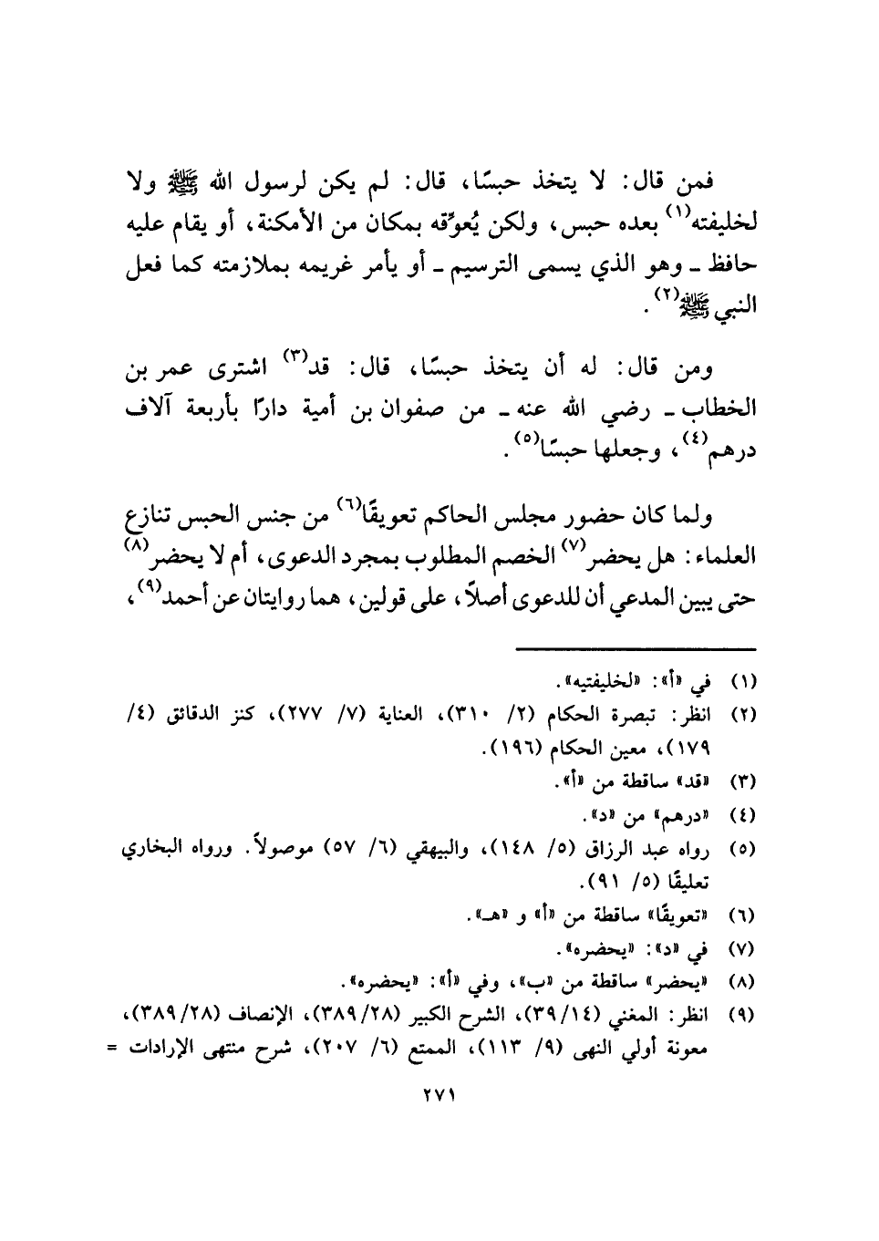 فمن قال: لا يتخذ حبسًا، قال: لم يكن لرسول الله - صلى الله عليه وسلم - ولا لخليفته (¬١) بعده حبس، ولكن يُعوِّقه بمكان من الأمكنة، أو يقام عليه حافظ - وهو الذي يسمى الترسيم - أو يأمر غريمه بملازمته كما فعل النبي - صلى الله عليه وسلم - (¬٢).