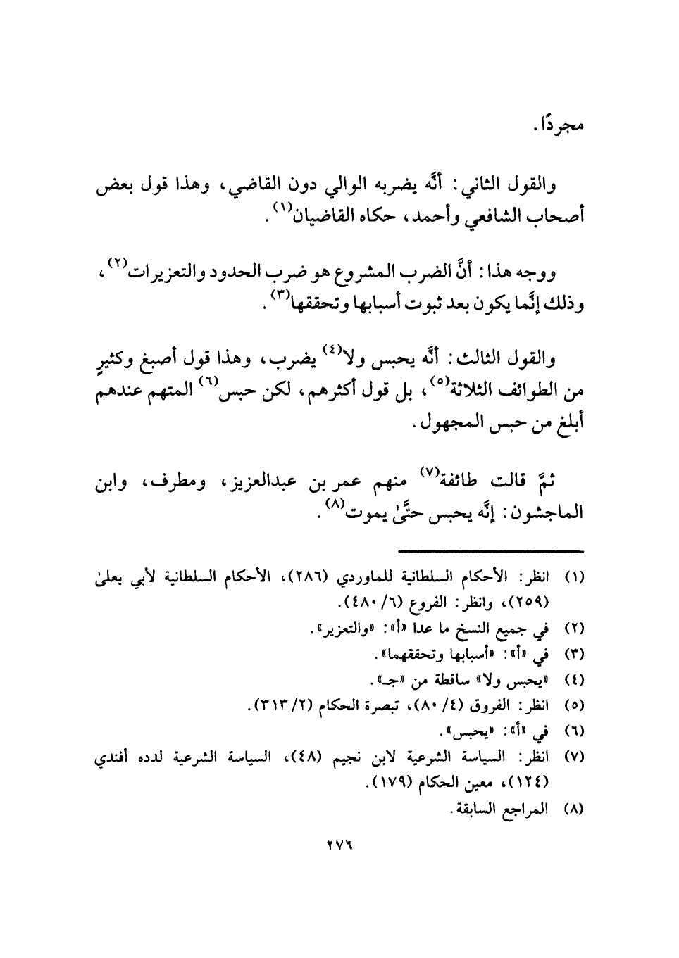 والقول الثالث: أنَّه يحبس ولا (¬٤) يضرب، وهذا قول أصبغ وكثيرٍ من الطوائف الثلاثة (¬٥)، بل قول أكثرهم، لكن حبس (¬٦) المتهم عندهم أبلغ من حبس المجهول.