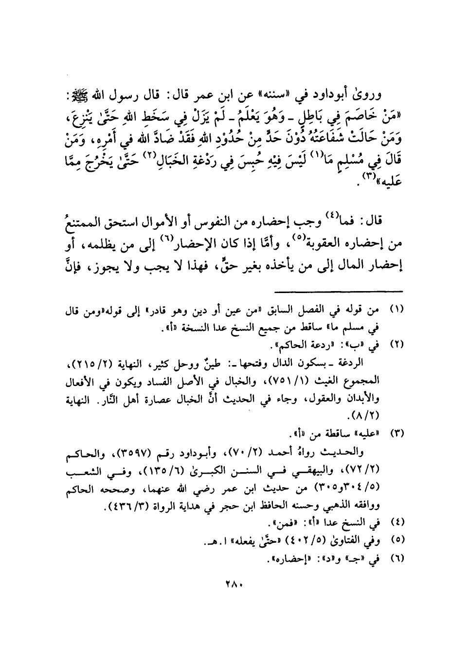 وروى أبو داود في "سننه" عن ابن عمر قال: قال رسول الله - صلى الله عليه وسلم -: "مَنْ خَاصَمَ فِي بَاطِلٍ - وَهُوَ يَعْلَمُ - لَمْ يَزَلْ فِي سَخَطِ اللهِ حَتَّى يَنْزِعَ، وَمَنْ حَالَتْ شَفَاعَتُهُ دُوْنَ حَدٍّ مِنْ حُدُوْدِ اللهِ فَقَدْ ضَادَّ الله في أَمْرِهِ، وَمَنْ قَالَ فِي مُسْلِمٍ مَا (¬١) لَيْسَ فِيْهِ حُبِسَ فِي رَدْغةِ الخَبَالِ (¬٢) حَتَّى يَخْرُجَ مِمَّا عَليه" (¬٣).