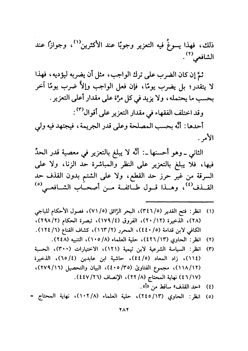 (¬٣) انظر: السياسة الشرعية لابن تيمية (١٢١)، الاختيارات (٣٠٠)، الحسبة (١١٤)، زاد المعاد (٥/ ٤٤)، حاشية ابن عابدين (٤/ ٦٥)، الذخيرة (١٢/ ١١٨)، مجموع الفتاوى (٣٥/ ٤٠٥)، البيان والتحصيل (١٦/ ٢٧٩)، (١٧/ ٤٦) نهاية المحتاج (٨/ ٢٢)، الإنصاف (٢٦/ ٤٤٧).
