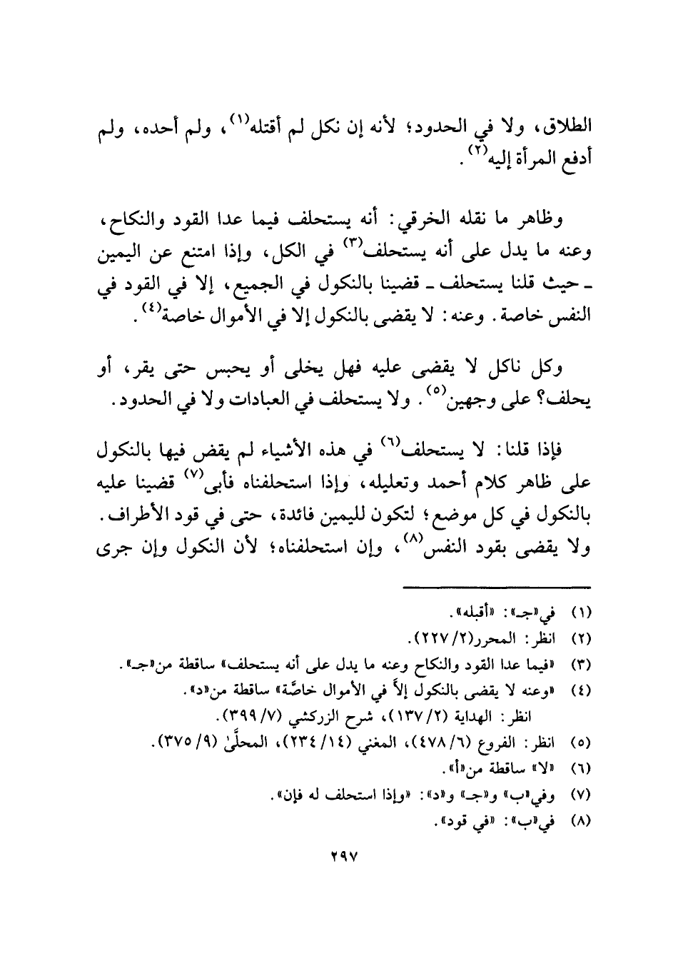 وظاهر ما نقله الخرقي: أنه يستحلف فيما عدا القود والنكاح، وعنه ما يدل على أنه يستحلف (¬٣) في الكل، وإذا امتنع عن اليمين - حيث قلنا يستحلف - قضينا بالنكول في الجميع، إلا في القود في النفس خاصة. وعنه: لا يقضى بالنكول إلا في الأموال خاصة (¬٤).