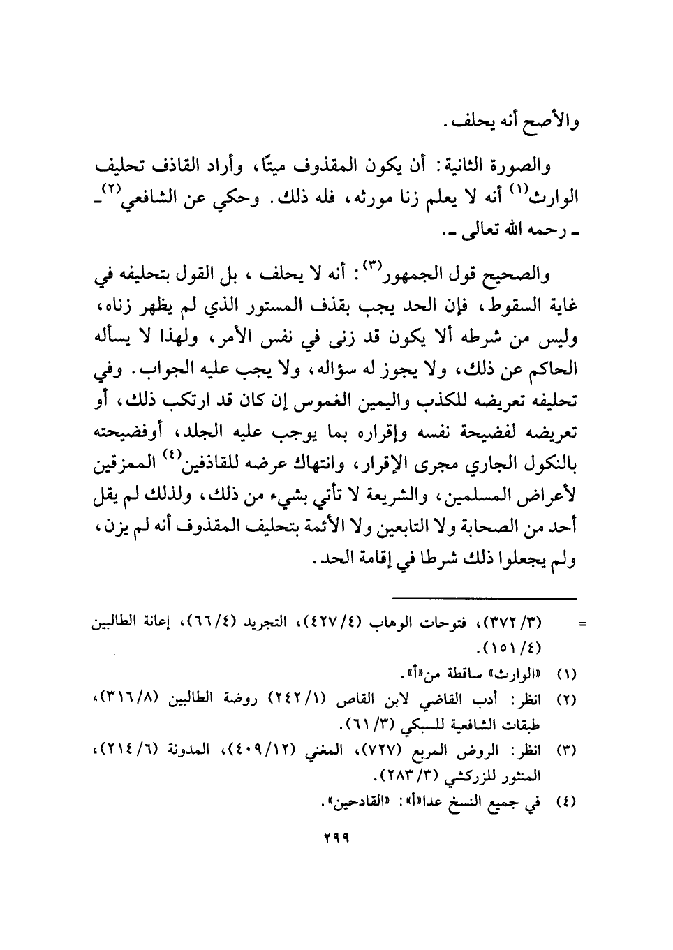 والصورة الثانية: أن يكون المقذوف ميتًا، وأراد القاذف تحليف الوارث (¬١) أنه لا يعلم زنا مورثه، فله ذلك. وحكي عن الشافعي (¬٢) - رحمه الله تعالى -.